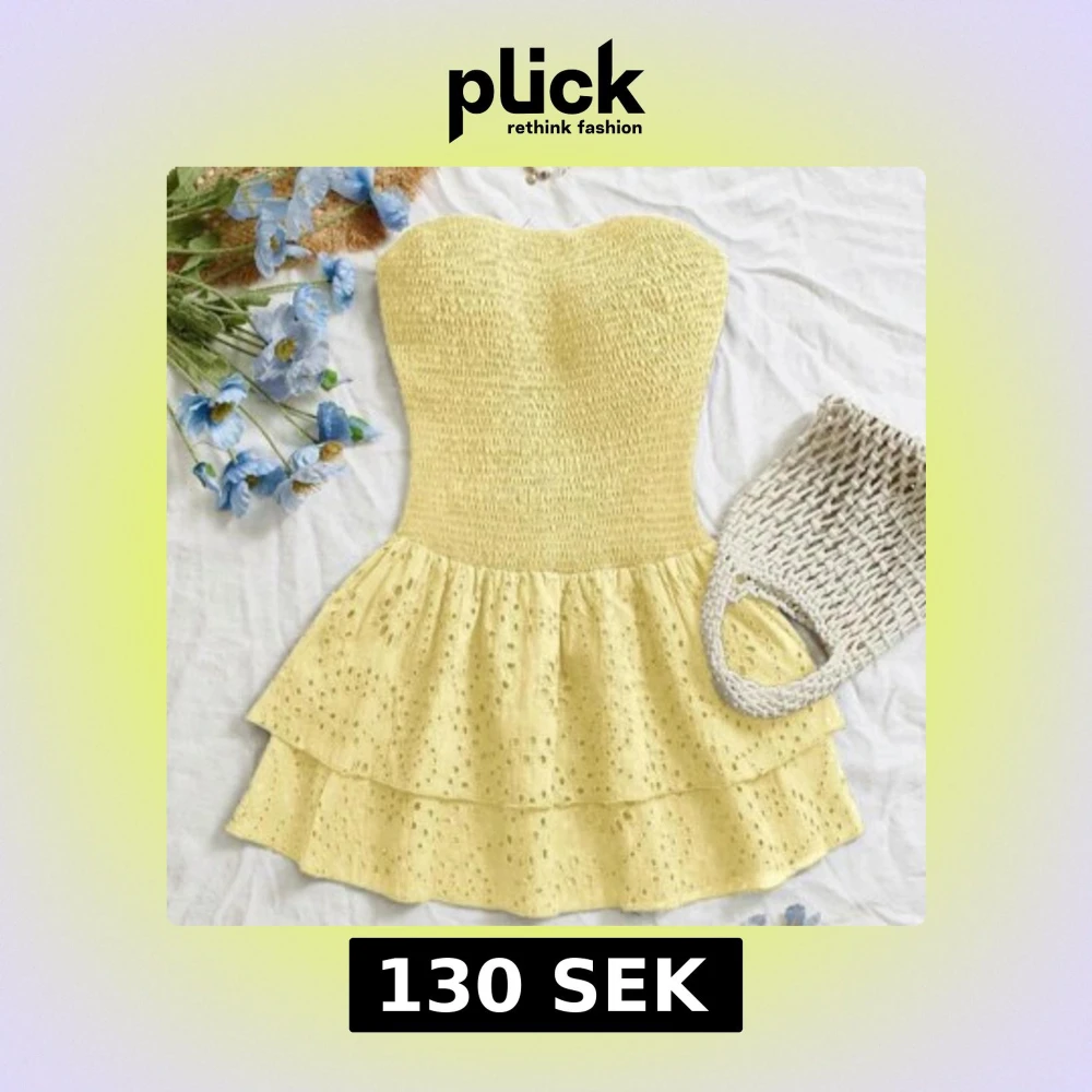 Supersöt gul kortklänning med smockad överdel och axelbandslös design. Kjolen har två lager volanger och broderade hål för en extra somrig vibe. Perfekt för varma dagar när du vill sticka ut lite extra. Köpte den från shein men beställde 2st så behöver sälja en. Det är storlek M och beställde den för 200kr och den är aldrig använd.