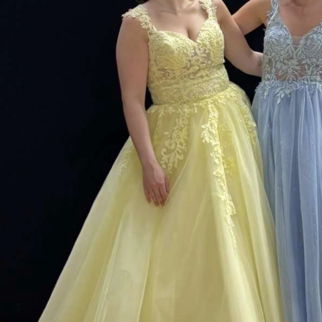 Drömmig gul balklänning med spetsdetaljer och snörning i ryggen. Kjolen är riktigt voluminös i flera lager tyll och har vackra broderade blommor med glitter. Andvänd 1 gång, från märket LQ design köpt på bröllopshuset i Linköping för 8000. Storleken är 40/M men är snörning i ryggen så går att få den lite större och även mindre. Finns att prova och köpa i Åtvidaberg. Underkjol, handskar och klädpåse ingår vid köp av klänningen!🤩💛 Skriv gärna för fler bilder eller frågor!💛