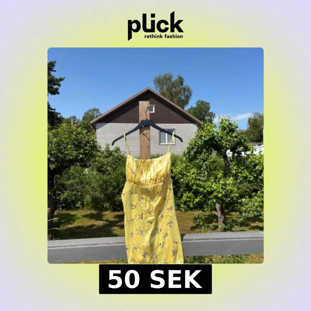 Gul klänning med lila blommor från asos. Använd en midsommar. Står som storlek 44 men jag som är S har använt den utan att det sett något konstigt ut!