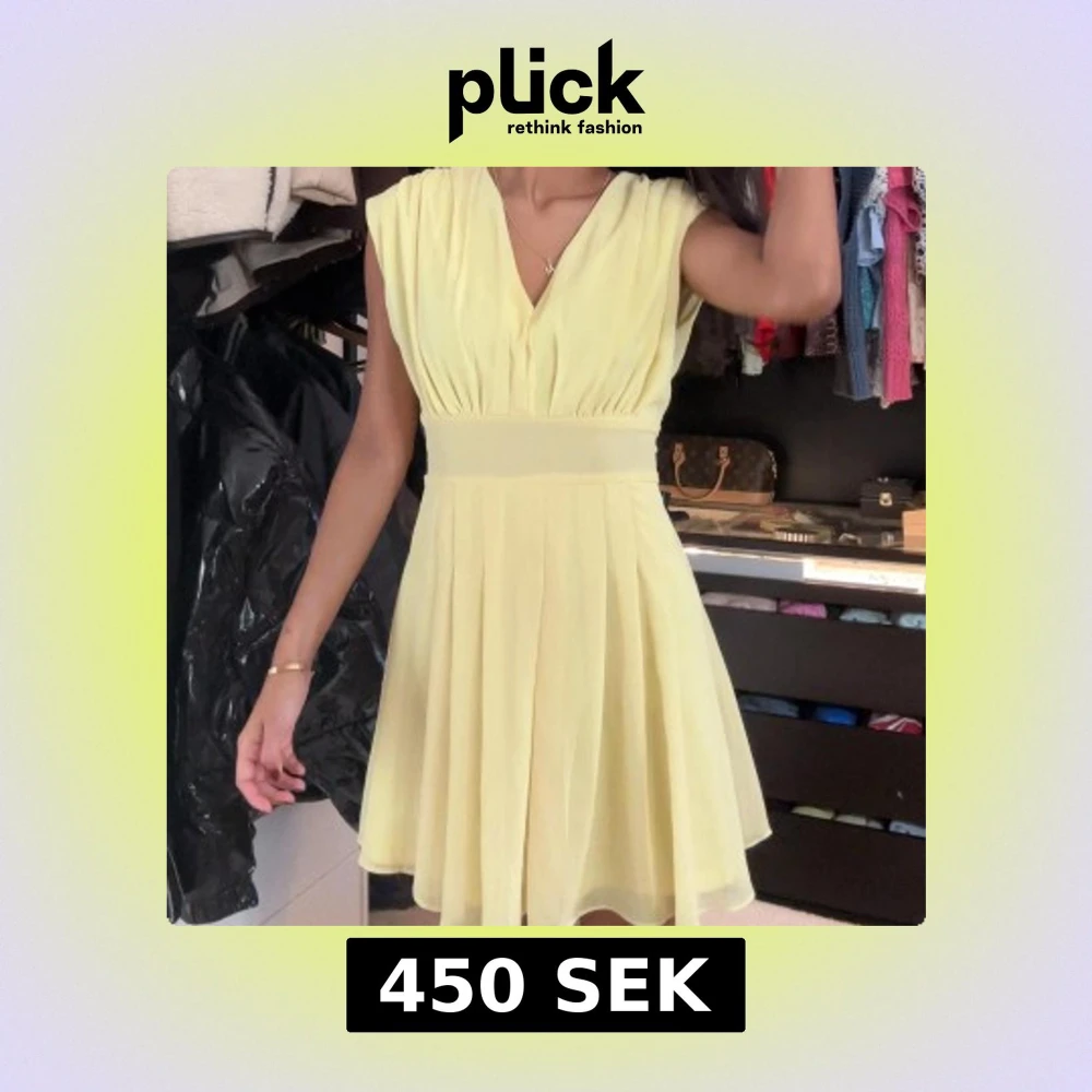 Charmig gul kortklänning med v-ringning och knytband i midjan. Klänningen har en luftig passform och är ärmlös, vilket gör den perfekt för varma dagar.