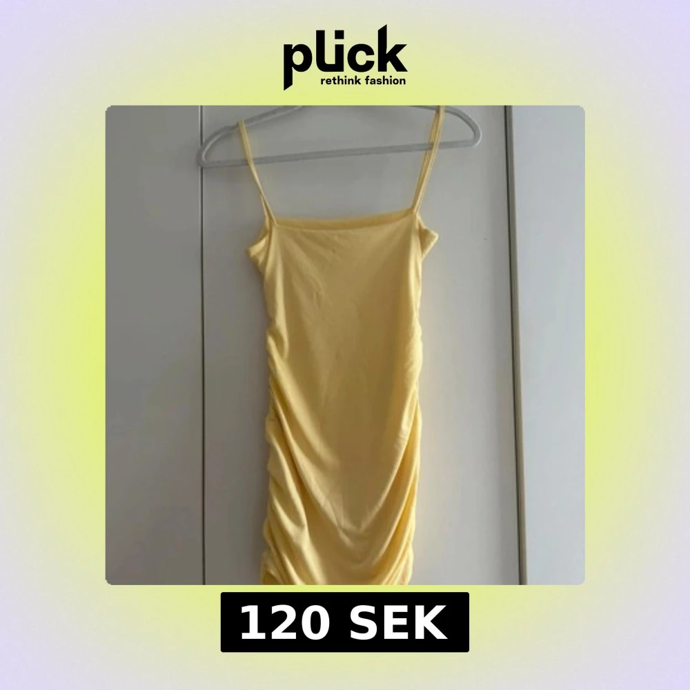 Snygg gul kort klänning med smala axelband och draperad effekt längs sidorna. Klänningen har en enkel, figurnära passform och är perfekt för varma dagar. Materialet känns mjukt och stretchigt