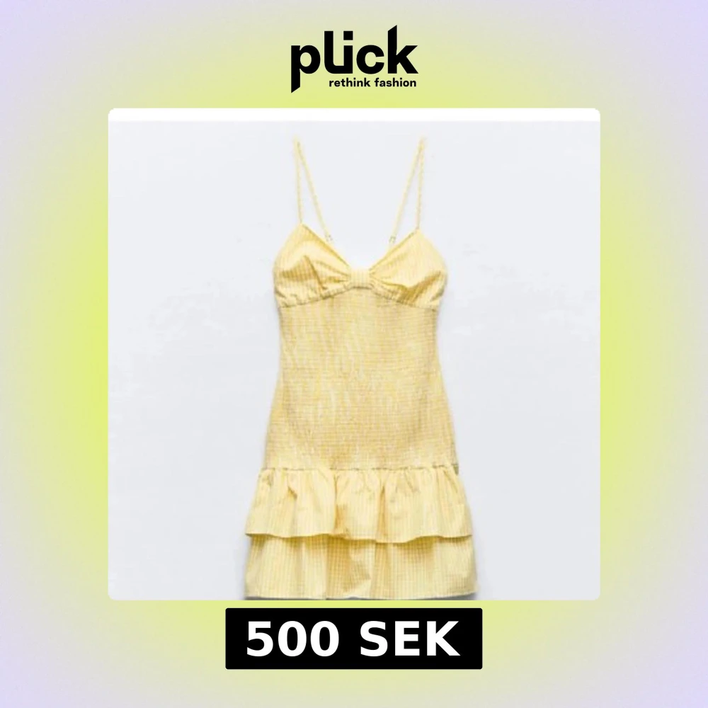 Söt gul kortklänning med tunna axelband, volang nertill och diskret randigt mönster. Helt ny, har aldrig använt
