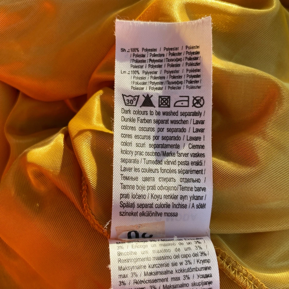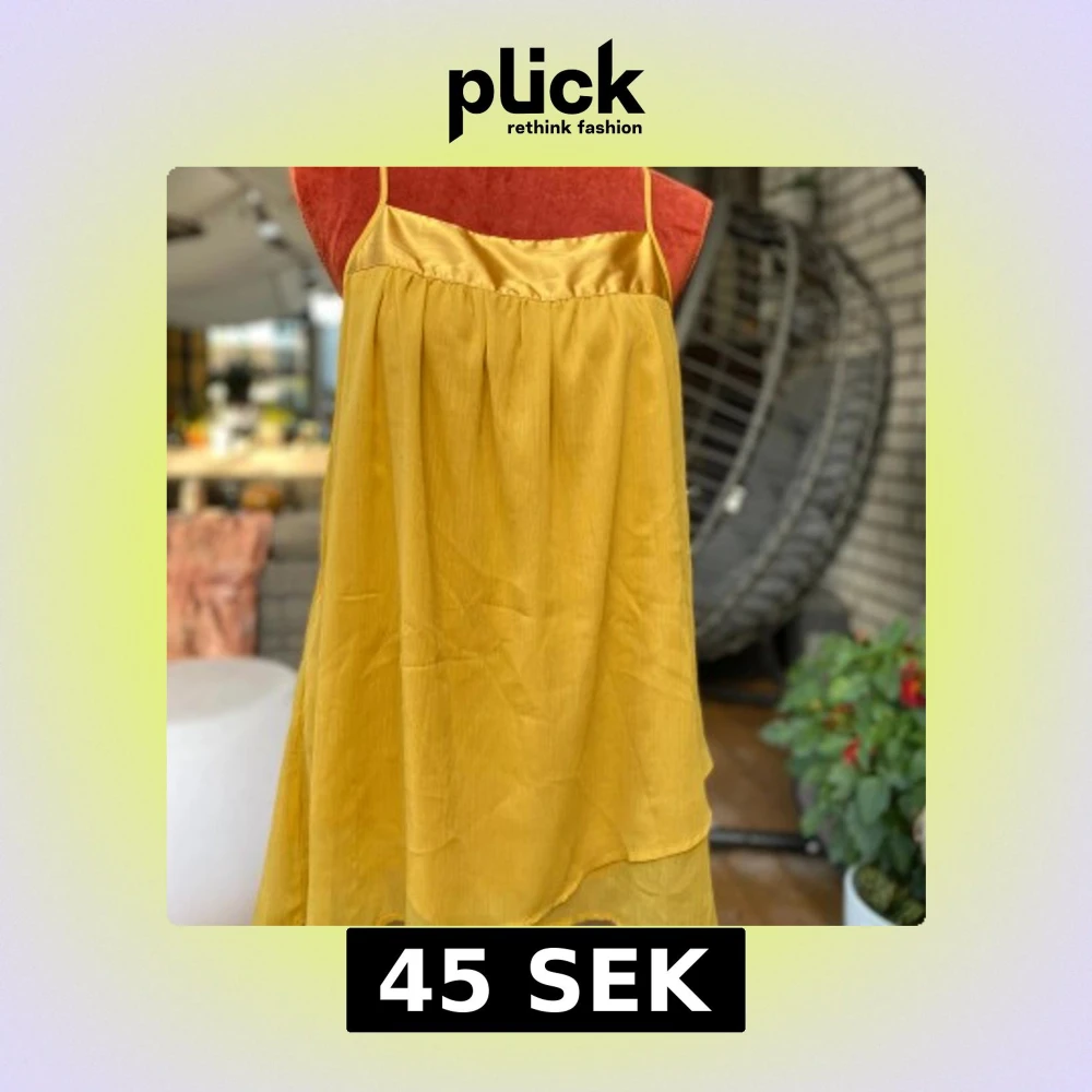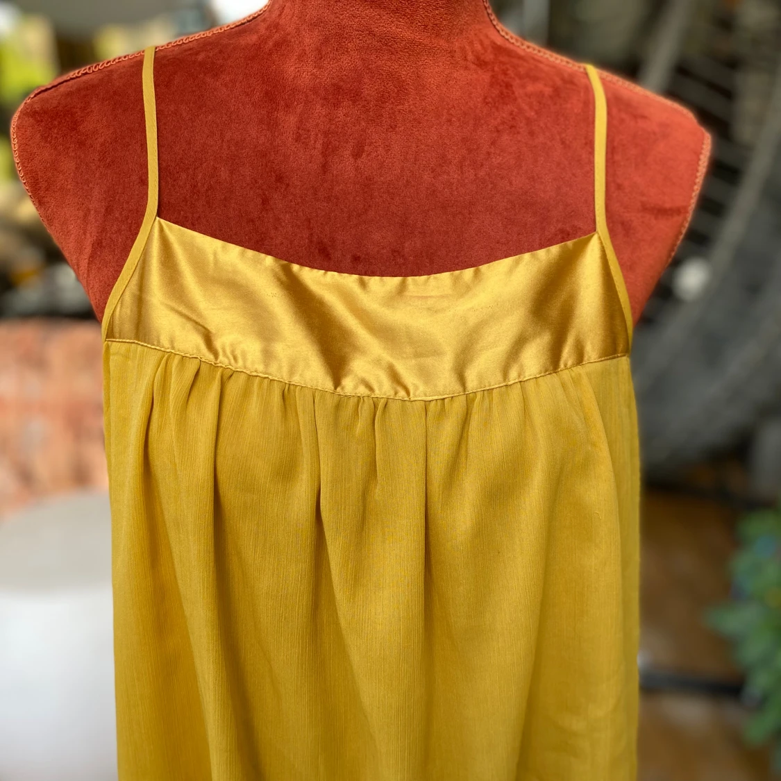 Guldfärgad linne med smala axelband. Linnet har en rak modell med en bredare kant upptill i ett glansigare tyg. Fint fall och dubbla lager. Polyester Längd: 72 cm Bystmått: 48 cm Inga bilder när den sitter på mig! Katter finns i hemmet!