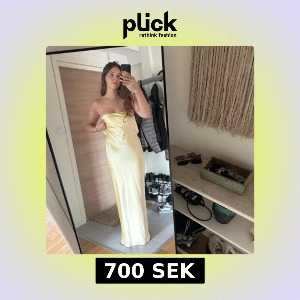 Säljer en elegant balklänning i gul satin. Klänningen är axelbandslös med en snygg öppen rygg och har en figurnära passform som faller mjukt längs kroppen. Perfekt för bal 😍 klänningen har två revor som syns på de sista bilderna annars är den som i ny skick😍