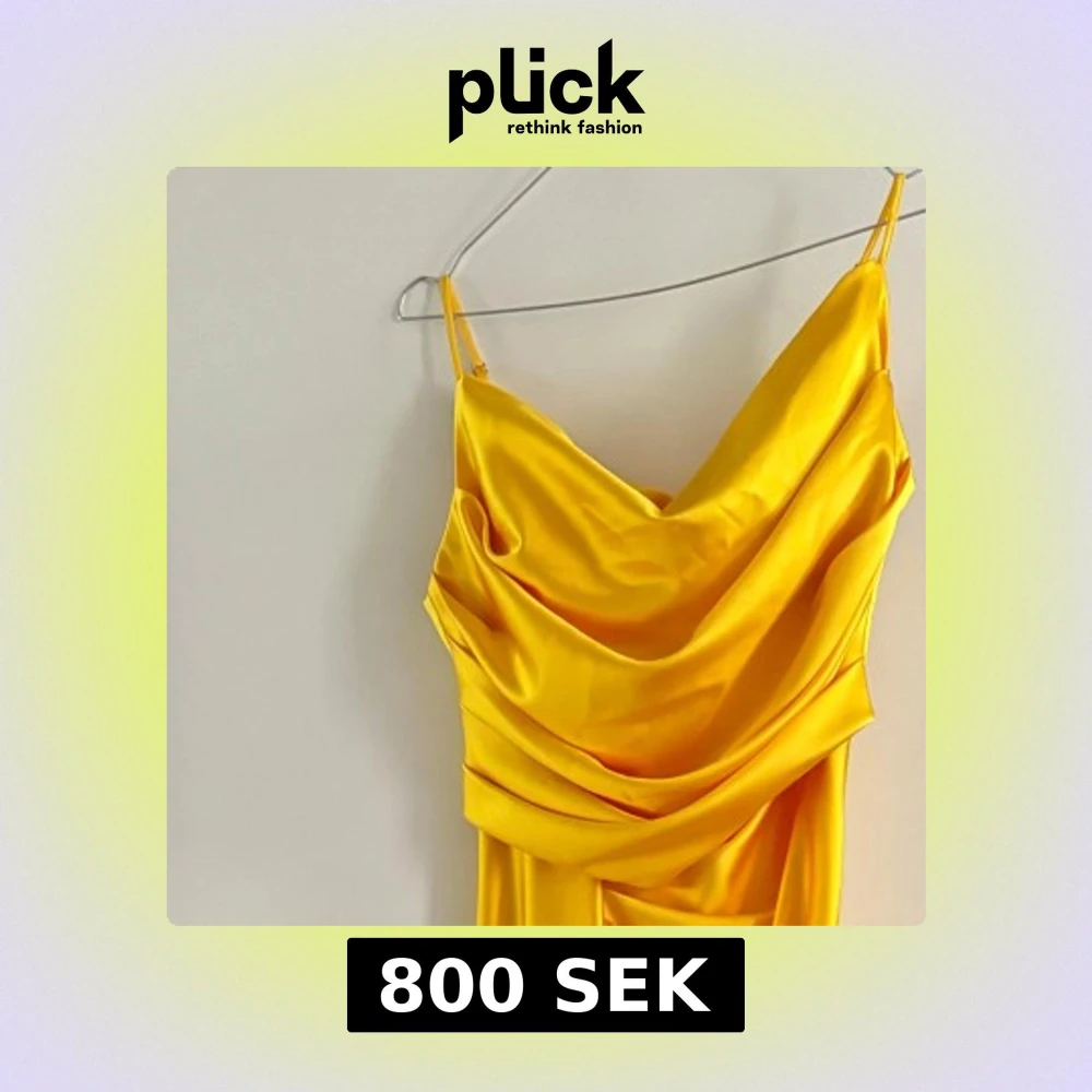 Säljer en maxilång gul klänning med tunna axelband och snygg drapering framtill. Klänningen har en glansig finish och faller mjukt längs kroppen, perfekt för dig som vill sticka ut med färg. Materialet känns lyxigt och har en satinkänsla.