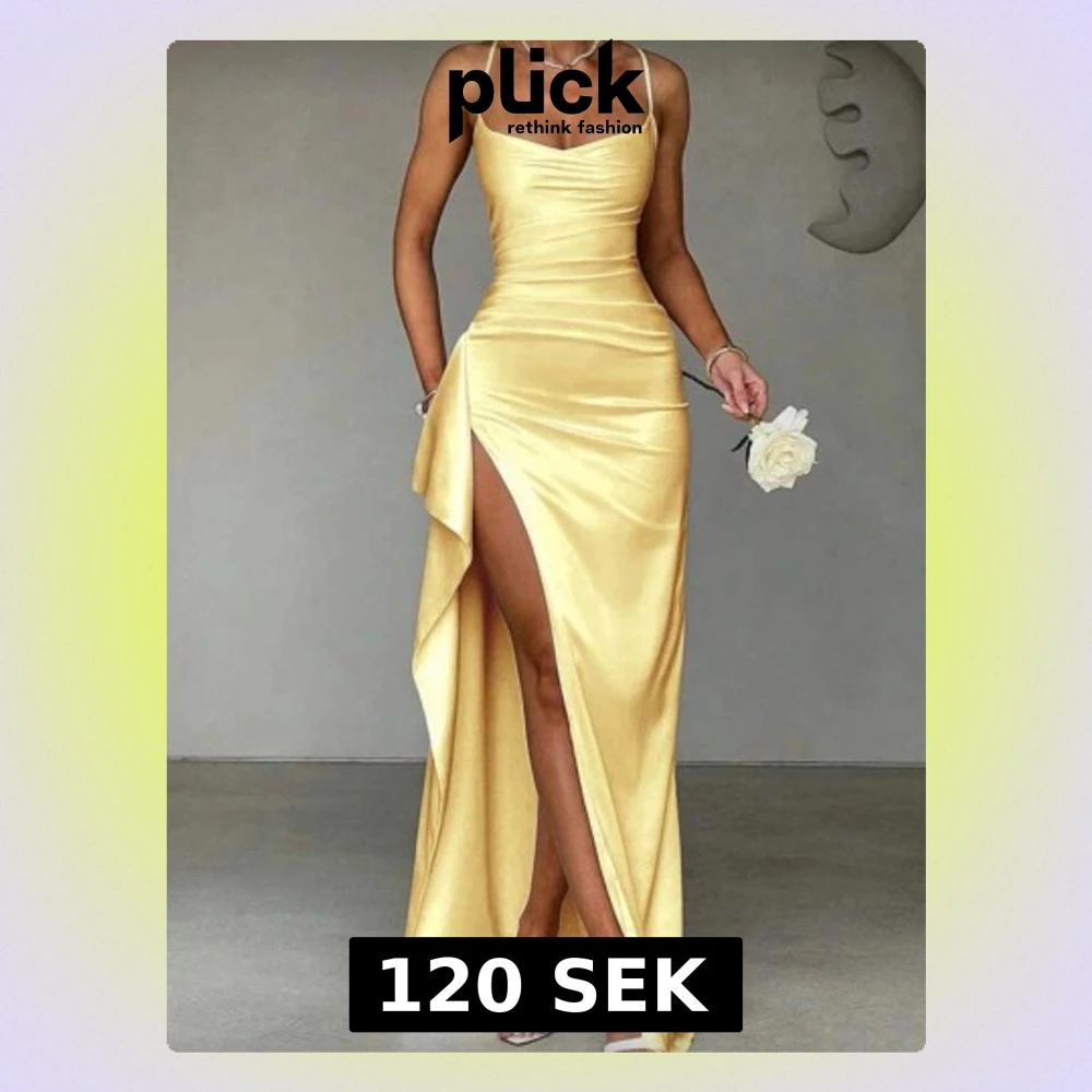 Elegant gul långklänning i satin med smala axelband och hög slits på sidan. Klänningen har figurnära passform, draperad byst och öppen rygg med korsade band. Perfekt för dig som vill sticka ut med en glamorös look. Aldrig använt, dock har den inte prislapp på för den har tvättats.