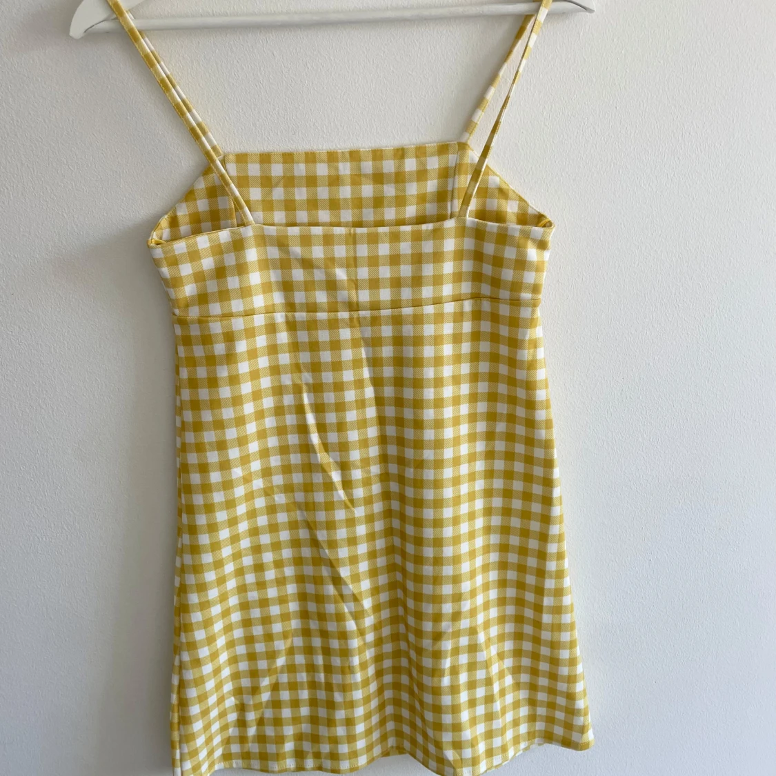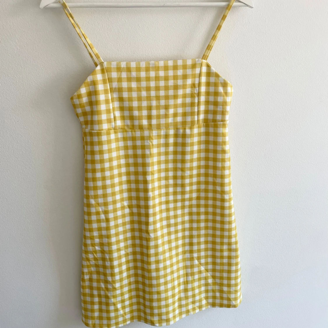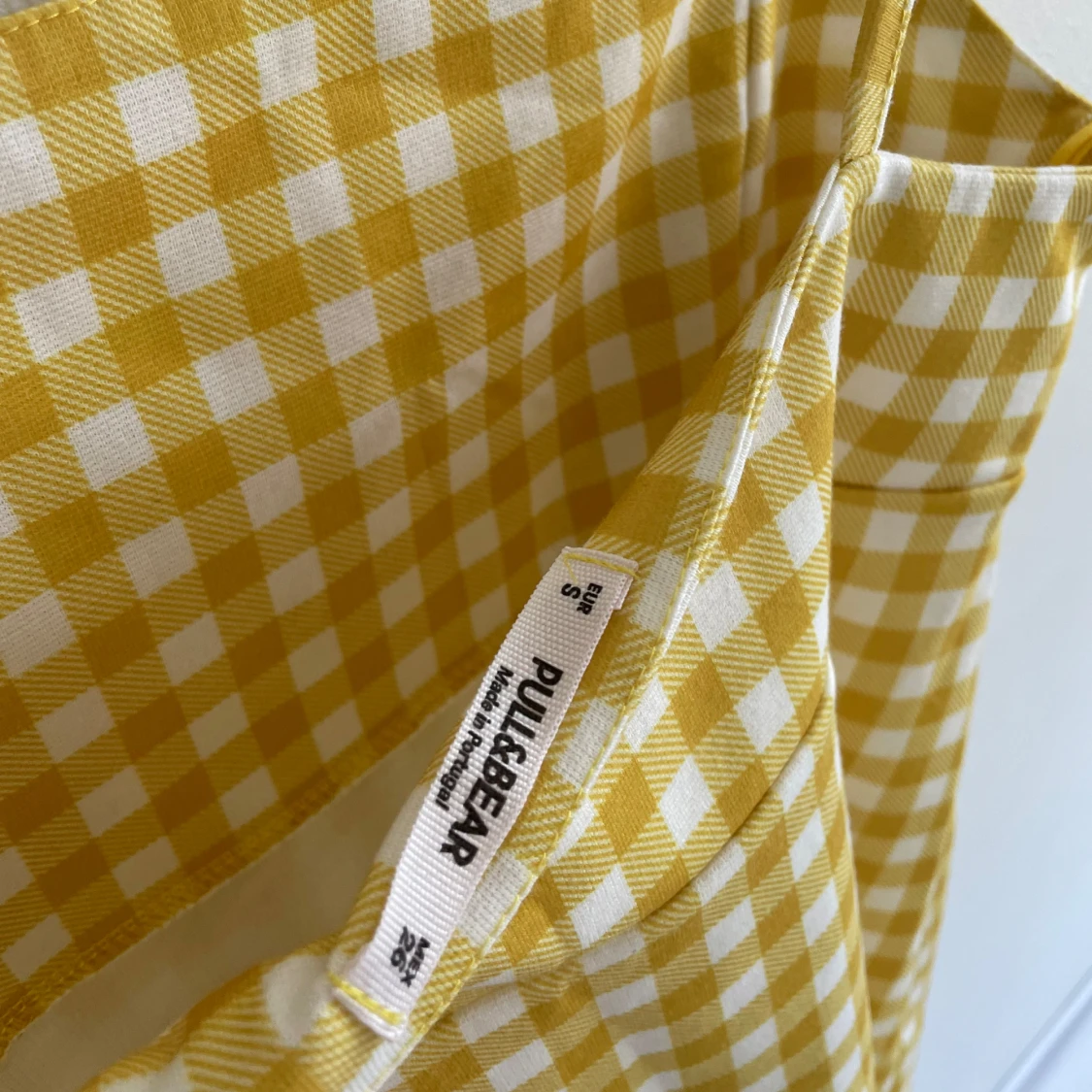 Superfin kort klänning från Pull&Bear i gul och vit rutig. Klänningen har smala axelband. Perfekt för dig som gillar färg och mönster! Storlek S.