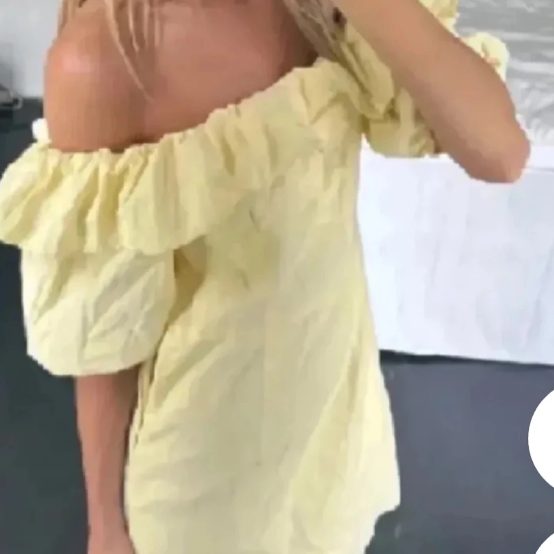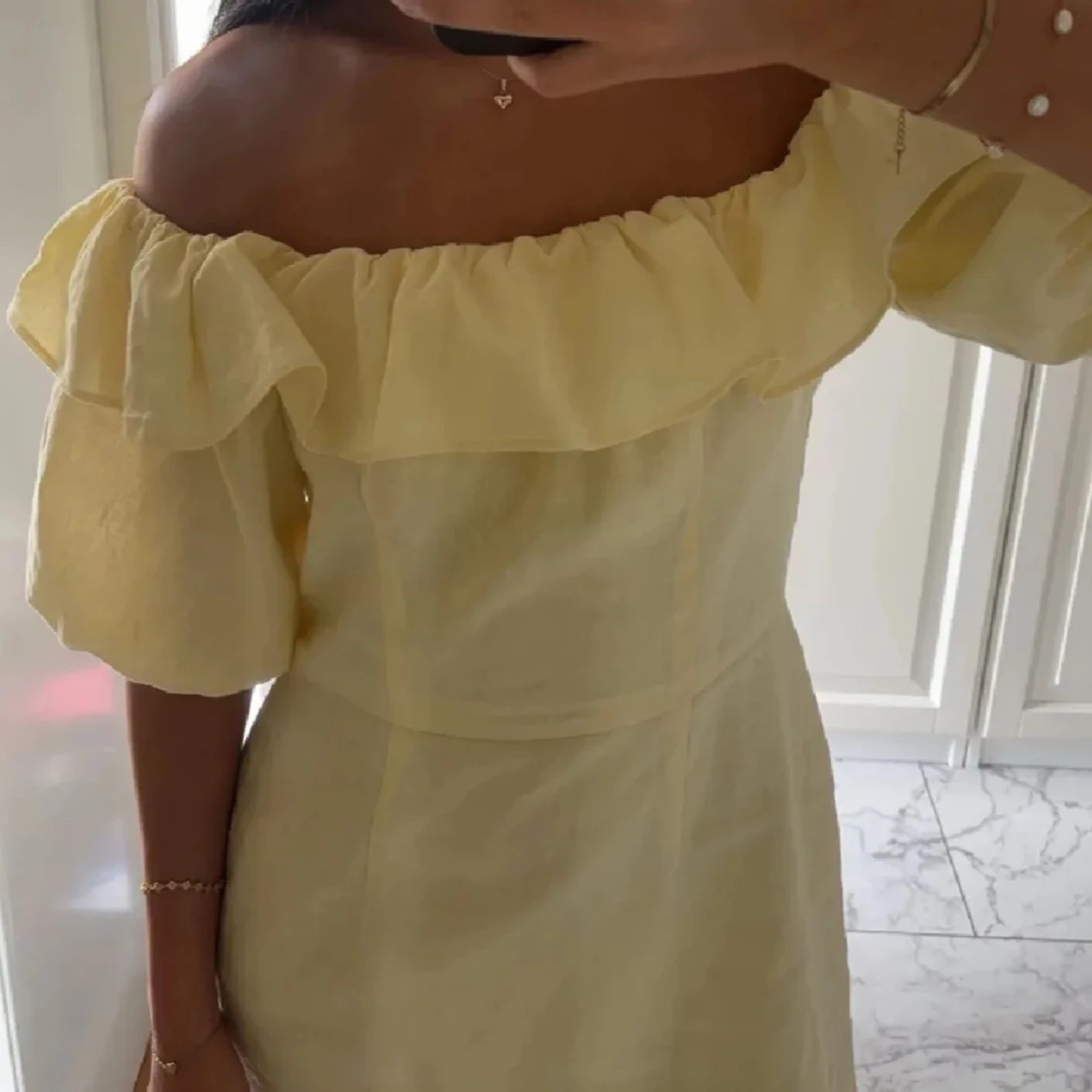 Söt gul klänning med offshoulder-modell och volangdetalj upptill. Storlek xs, fint skick.