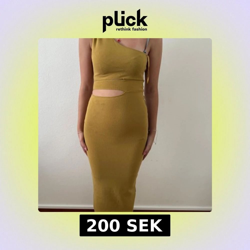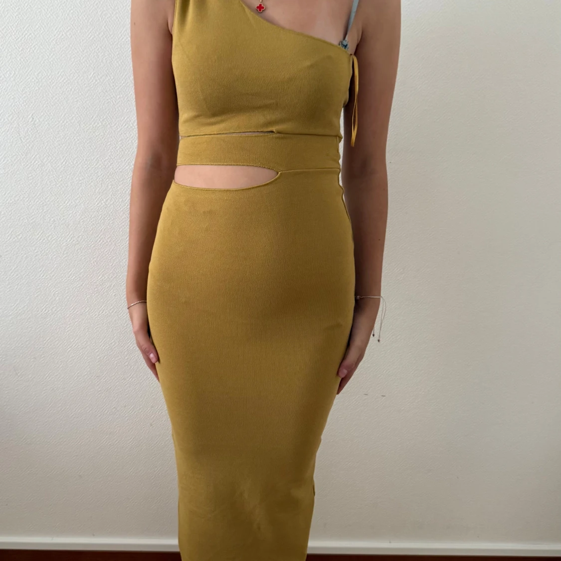 Snygg gul långklänning med one shoulder och cut-out detalj vid midjan. Klänningen har en tight passform och är ärmlös, perfekt för dig som vill sticka ut. Materialet är stretchigt och följsamt.
