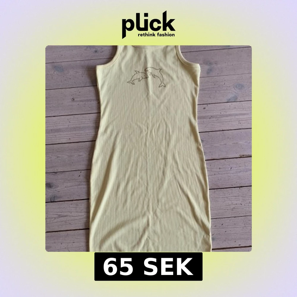 Denna klänning har använts fåtal gånger. Söt ljusgul ribbad klänning från Lindex med tight passform. Ärmlös modell med rund halsringning och glittriga delfiner framtill. Perfekt för sommarens varma dagar och enkel att styla med sneakers eller sandaler.