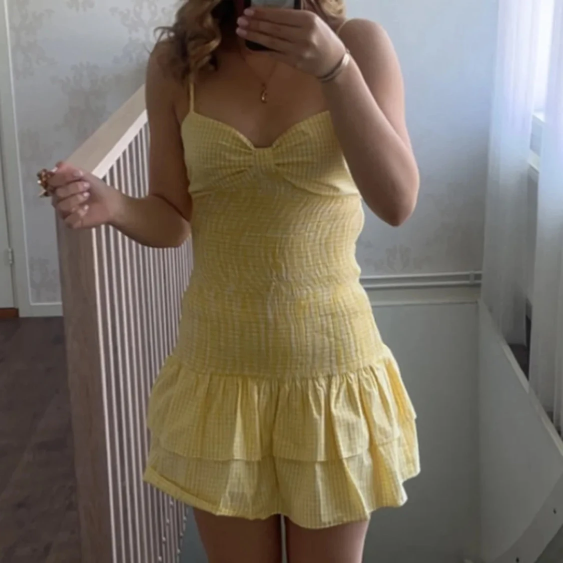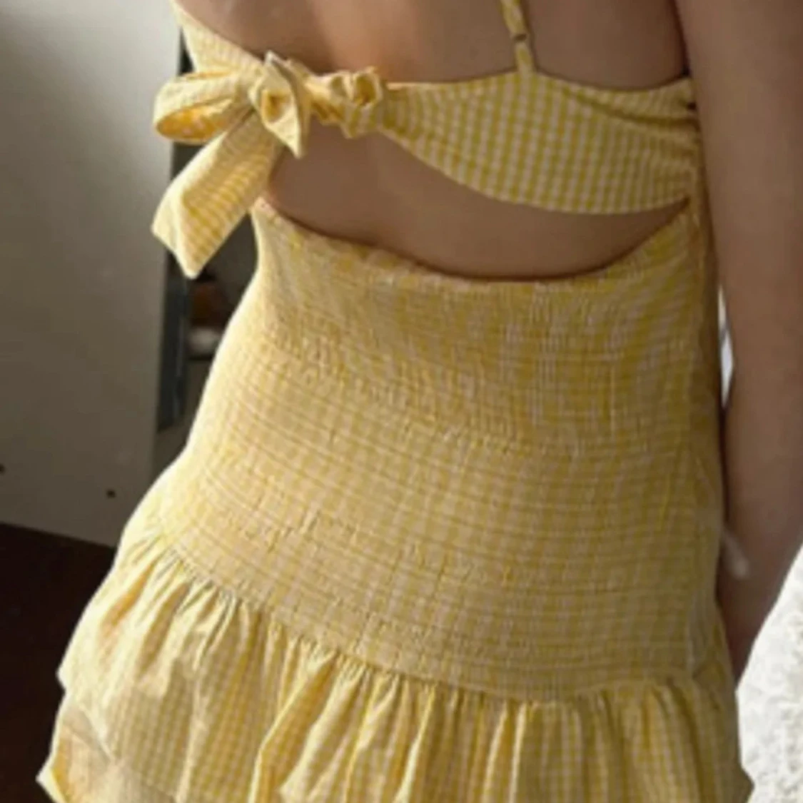 Superfin gul kortklänning med rutigt mönster och volangkant. Klänningen har smala axelband, söt rosett i ryggen och öppen rygg.❣️