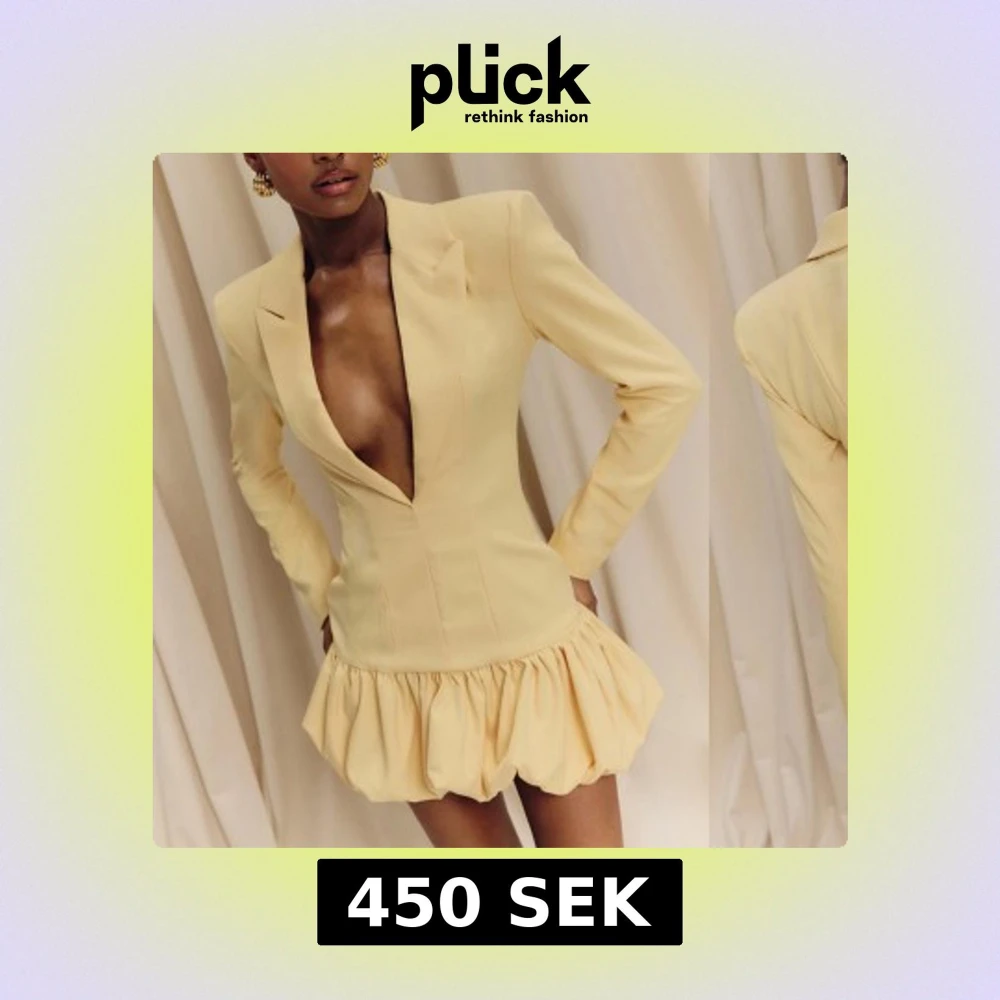 Supersnygg ljusgul kort klänning med markerad midja, djup v-ringning och lång ärm. Kavajliknande överdel och voluminös volangkjol ger en unik och trendig look. Perfekt för dig som vill sticka ut med stilren elegans och cool siluett. Använd en gång så precis som ny