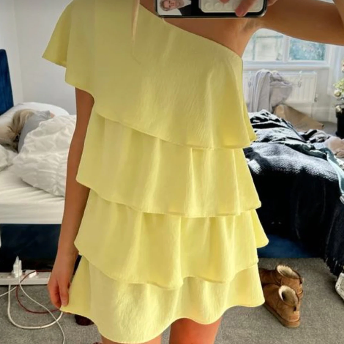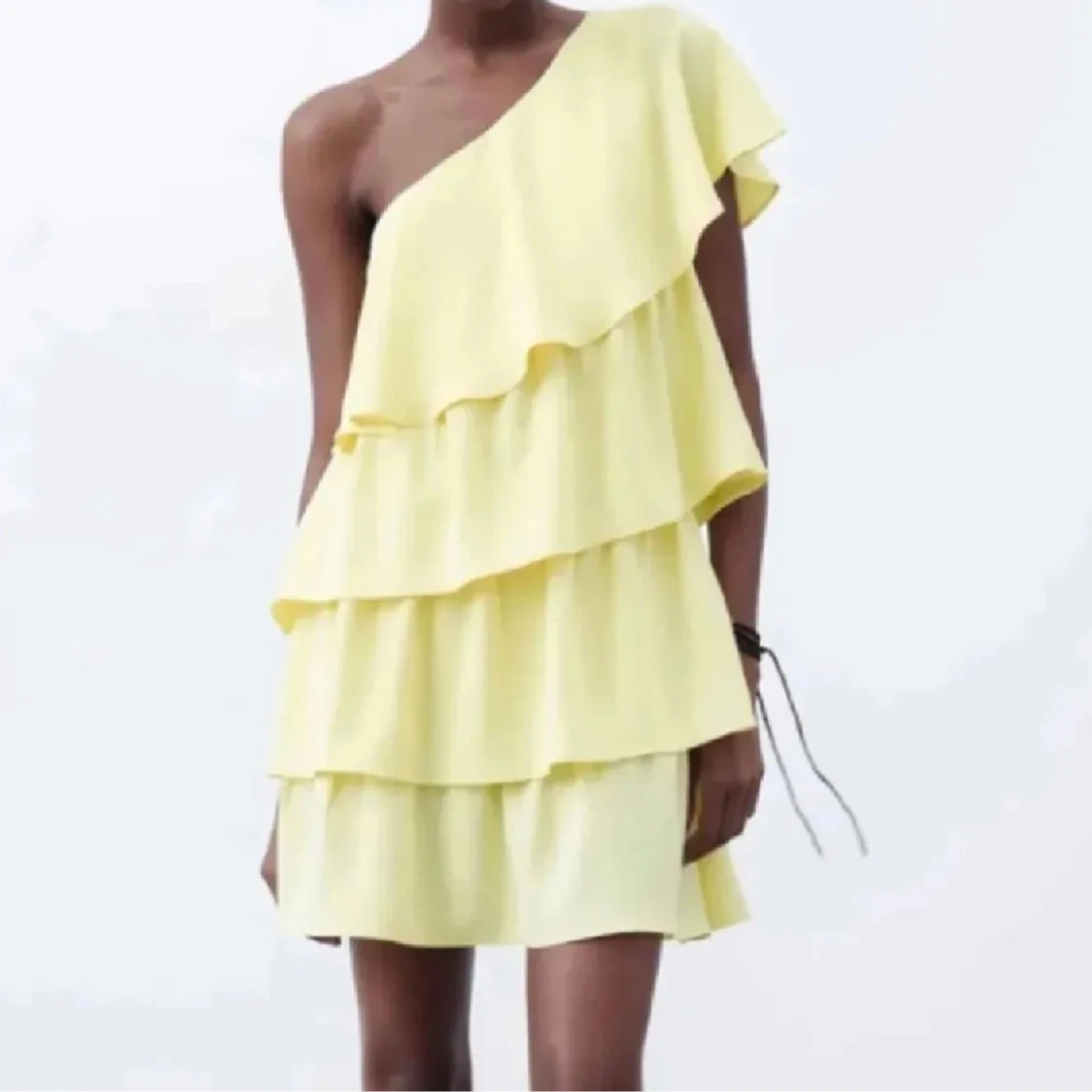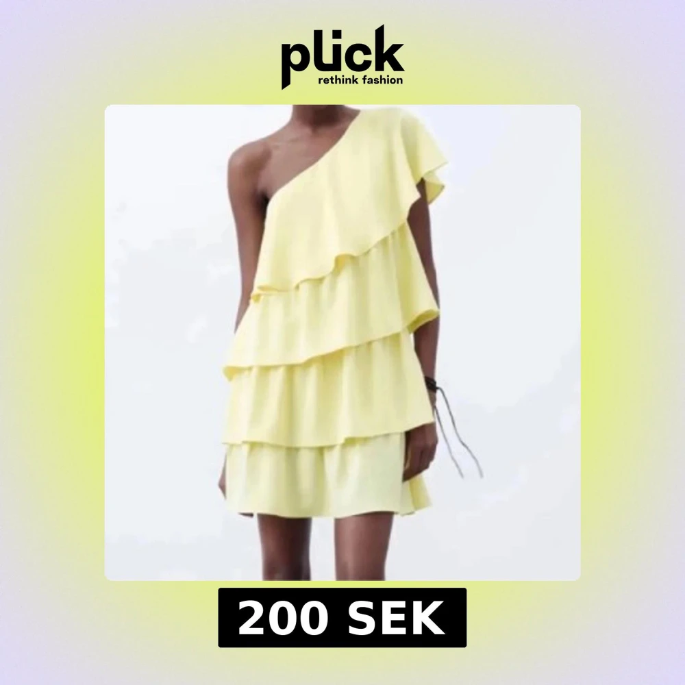 Superfin kort gul klänning med flera volanger och asymmetrisk one shoulder. Köpt för några år sen men bara använd några gånger. Storlek S och i nytt skick verkligen!