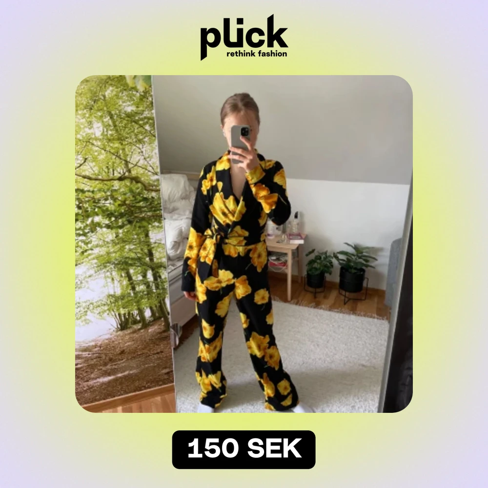 Gulblommig byxdress med knyte i midjan och vida ben. Mycket bekväm och sitter väldigt bra. Gömd dragkedja längst fram och fickor på sidorna. Köpt från Bik Bok i storlek S. Jag är på bilden 165 cm lång.