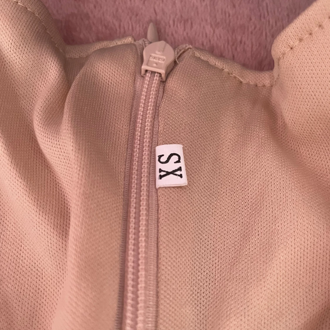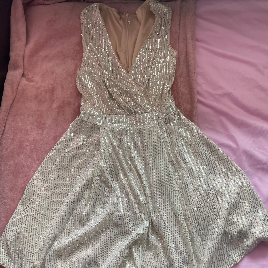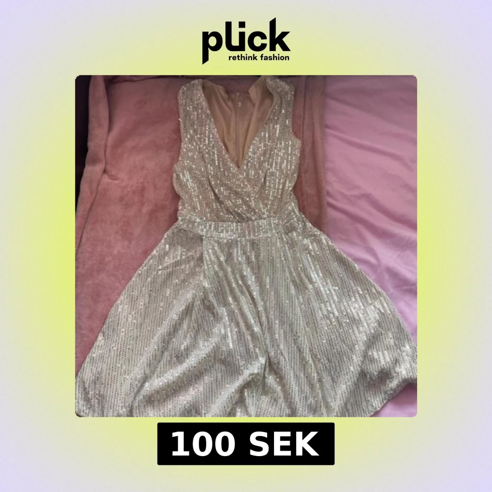 Säljer en glittrig guldklänning med omlott-design och v-ringning. Klänningen har en dragkedja i ryggen och är ärmlös, perfekt för festliga tillfällen. Den har en elegant och skimrande look som verkligen sticker ut.