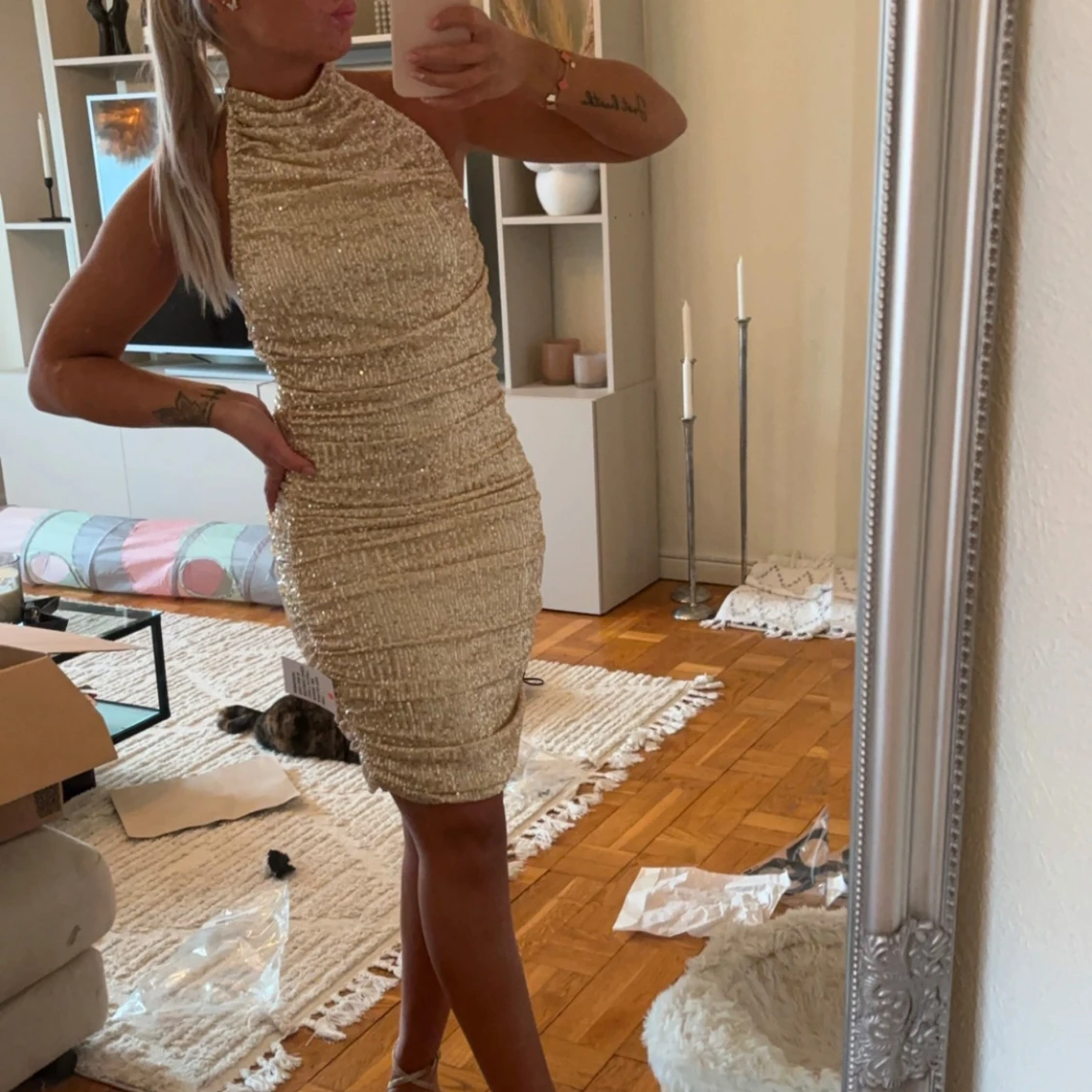 Säljer en superglittrig guldklänning som verkligen fångar ögat! Den är tight och kort, perfekt för festliga tillfällen. Klänningen har en hög hals och är ärmlös med en öppen rygg som ger en elegant touch. Materialet är glittrigt och skimrande, vilket gör den idealisk för nyår eller andra speciella tillfällen. Använd en gång!