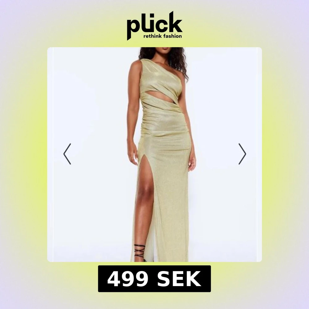 Snygg guldglittrig oneshoulderklänning med slits och cut-out detaljer. Perfekt för en glamorös kväll. Klänningen har en figurnära passform och är i ett glittrande material som fångar ljuset vackert. Aldrig använd. Lappen sitter kvar. Från NAKD x Lojsan Wallin