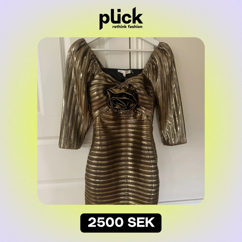 Säljer en superfin guldig klänning från LoveShackFancy i storlek S. Den har en glittrig finish med trekvartsärmar och en snygg detalj framtill. Perfekt för festliga tillfällen! ✨nypris 5500kr