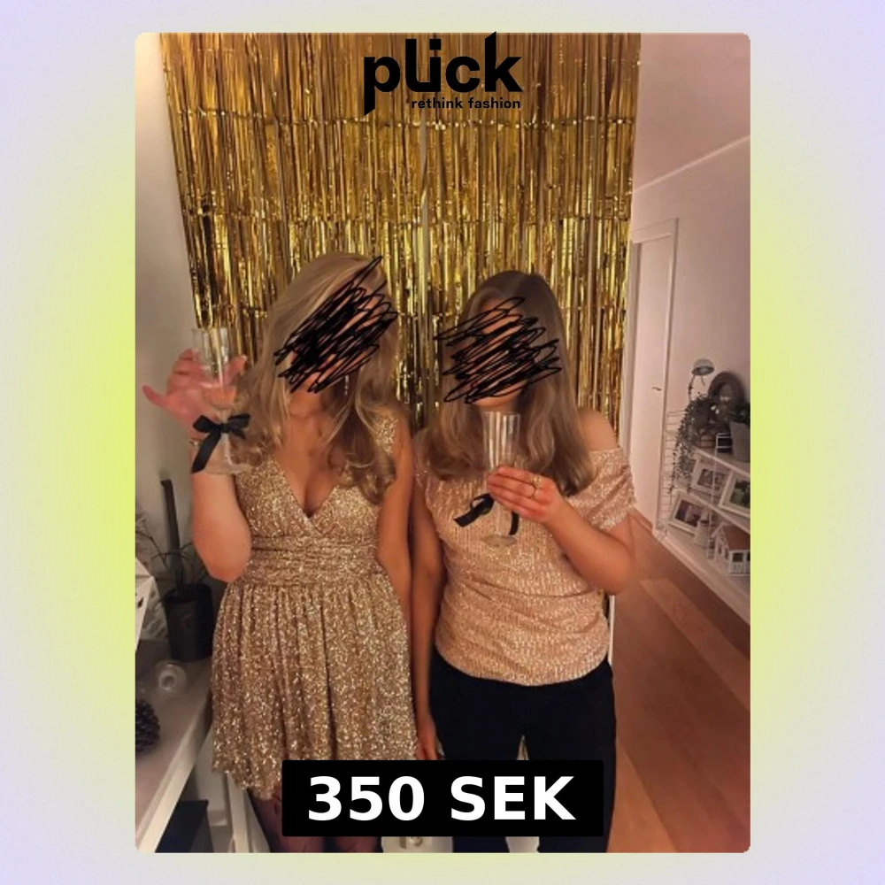 Supersnygg kort glittrig klänning i guld från Meet Me There. V-ringning och markerad midja. I nycksick, använd 1 gång. Storlek XXS-XS men passar även S