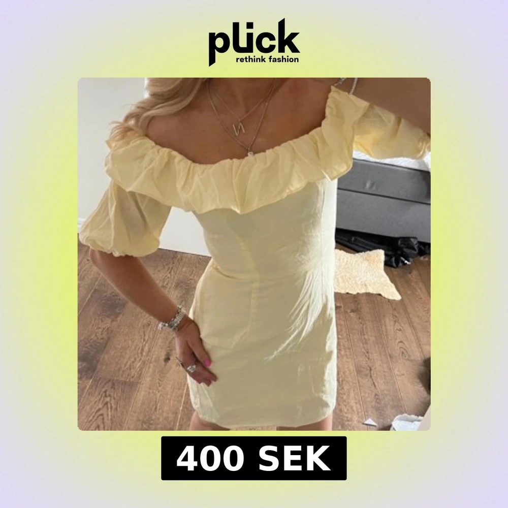 Ljusgul kortklänning med offshoulder och volang runt halsringningen