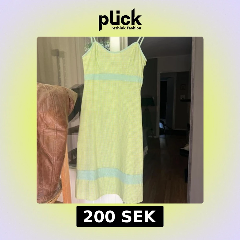 Söt kort klänning med smala axelband i ljusgul och mintgrön rutig bomull. en lätt figurnära passform. Perfekt för varma dagar och ger en fräsch, retroinspirerad look. Från Italien. Säljer eftersom att den var för liten på mig.