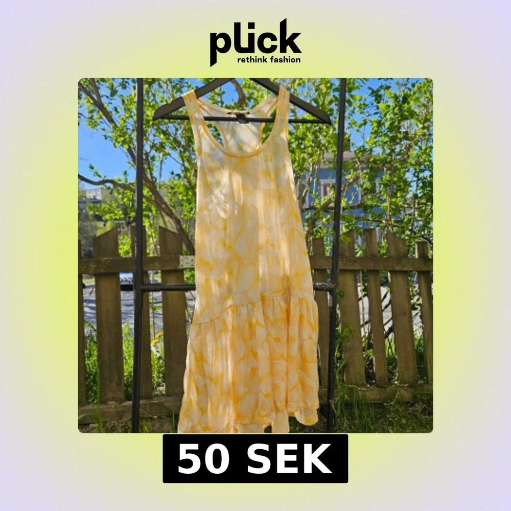 Söt gulvit klänning med bladmönster och volang nertill. Ärmlös modell med rund halsringning och lös passform, perfekt för varma dagar. Lätt och luftig, passar till sommarens alla tillfällen.