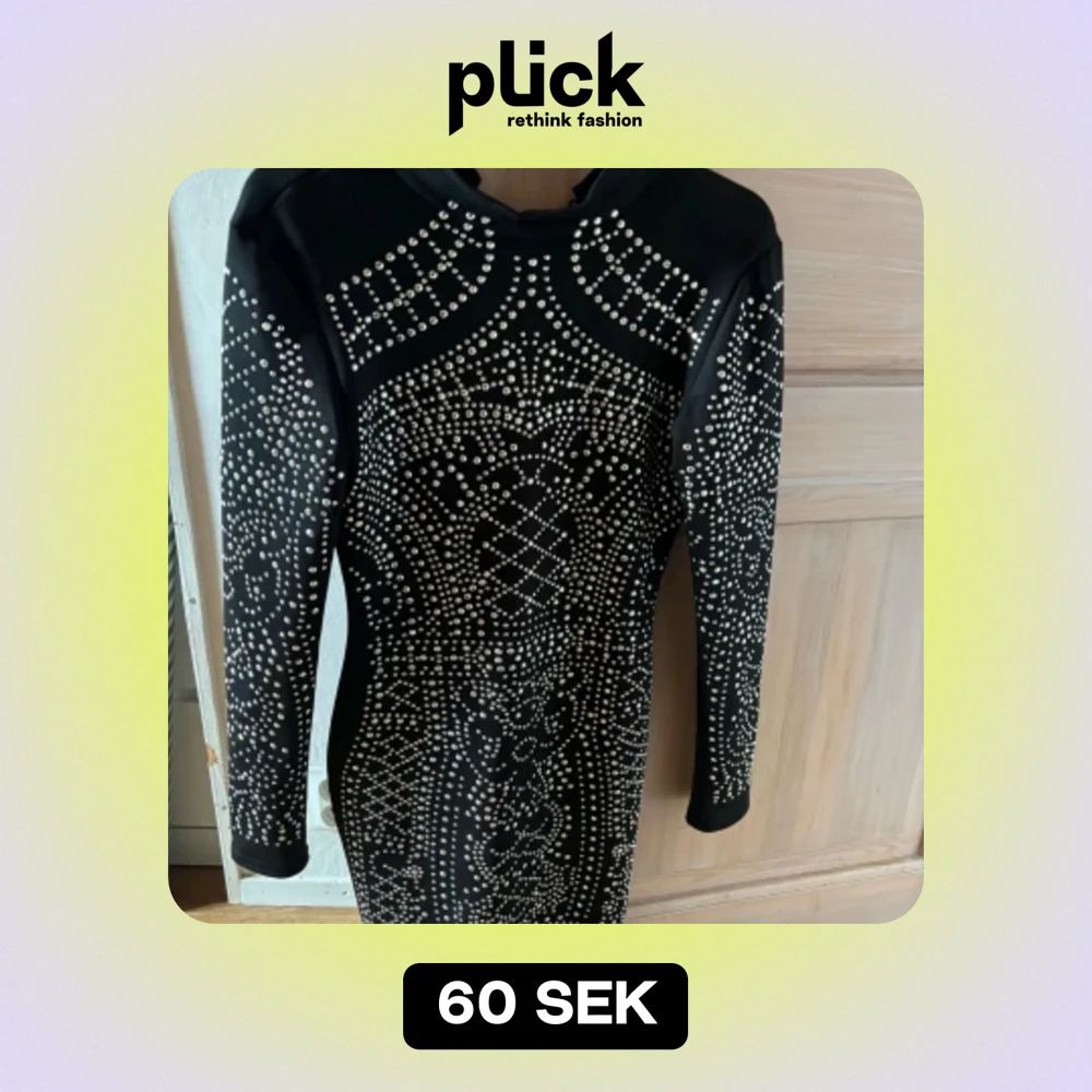 Säljer en supercool svart klänning med glittriga paljetter över hela framsidan. Den har en tight passform och långa ärmar, perfekt för en festkväll! Klänningen har en dragkedja framtill och är i nyskick.