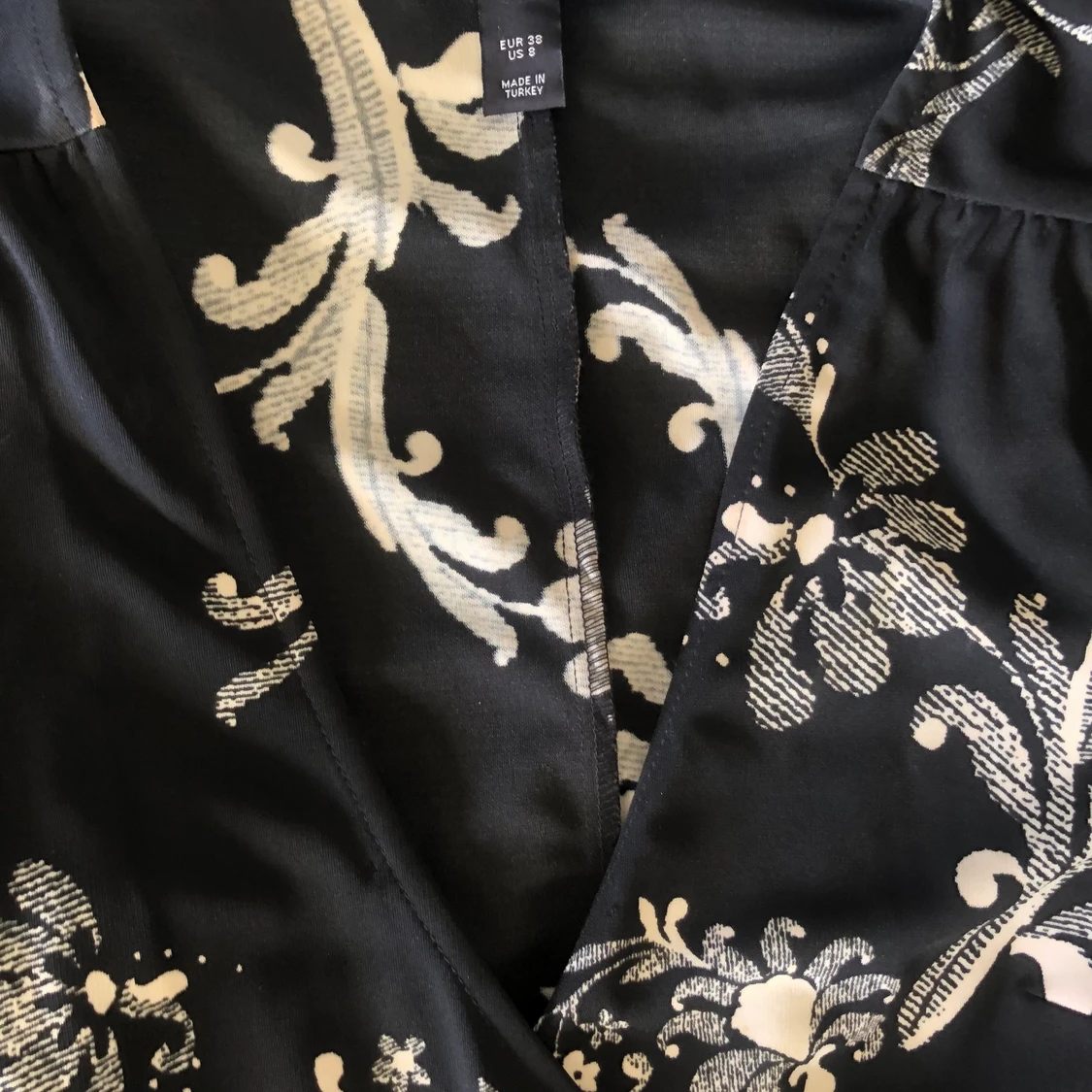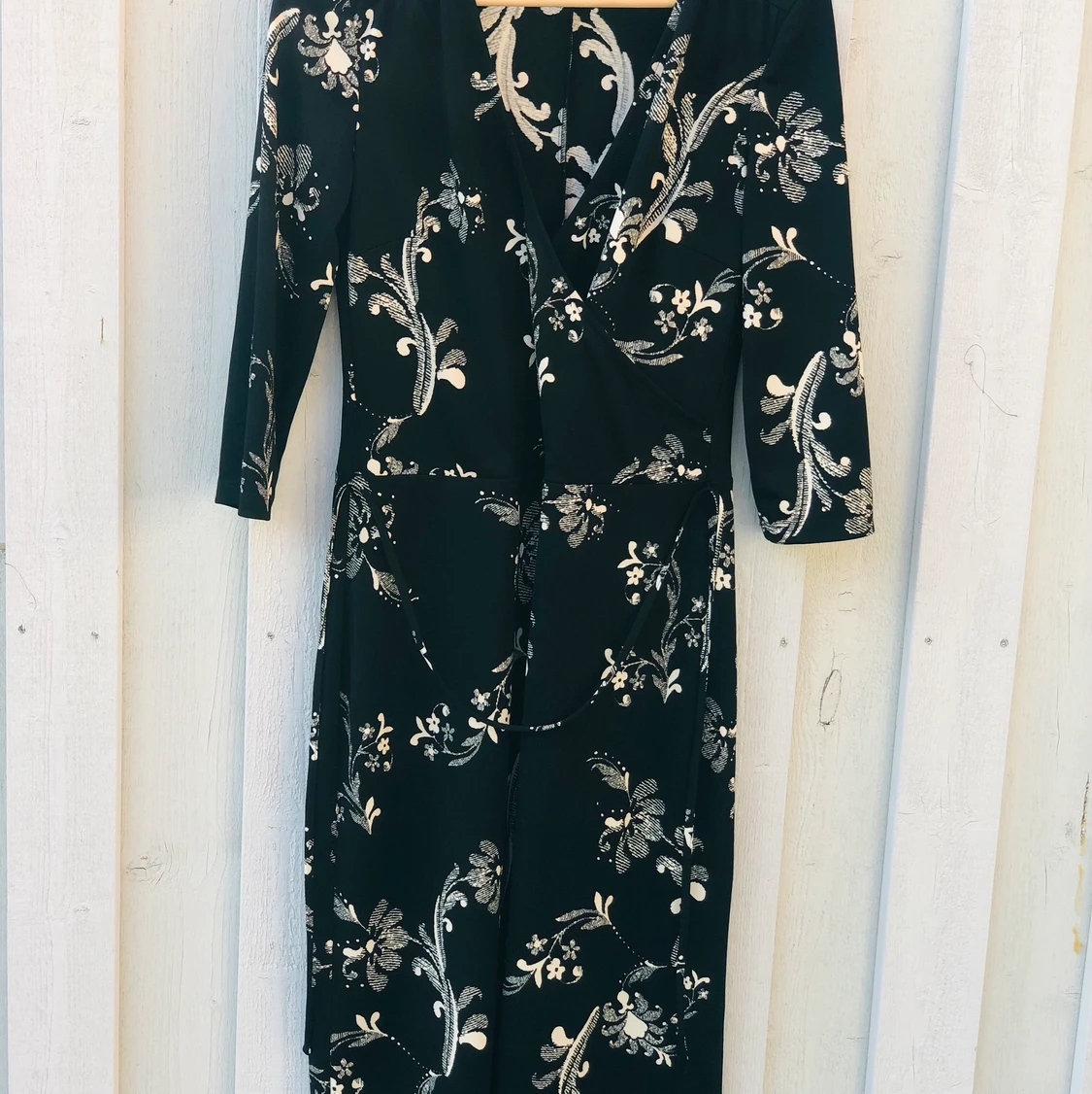 Mönstrad klänning som känns festlig. Knytband runt midjan. Har själv använt denna på ett dop och en begravning. Inköpt för 10 år sedan