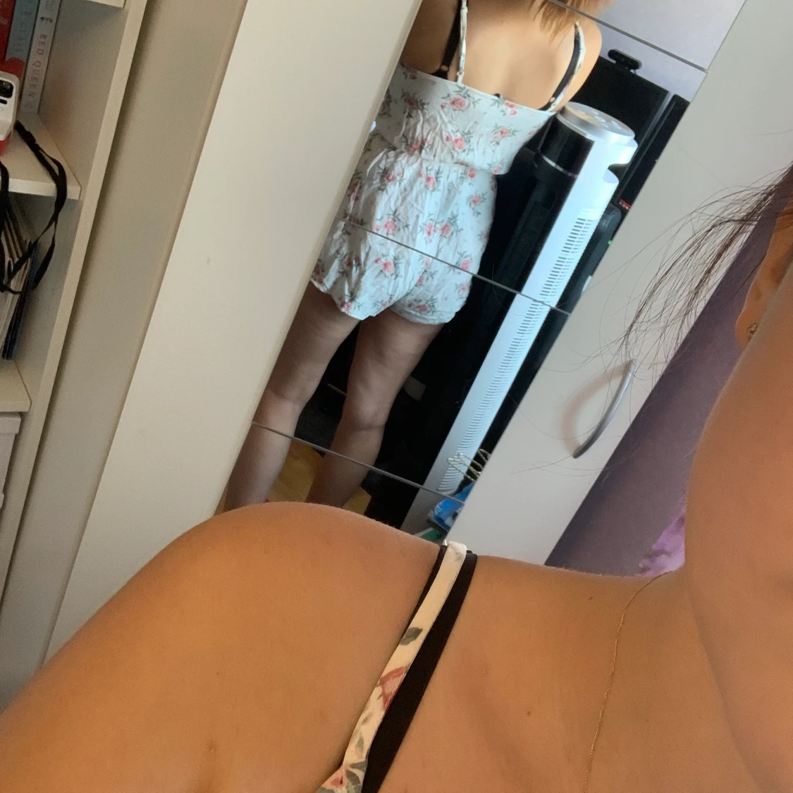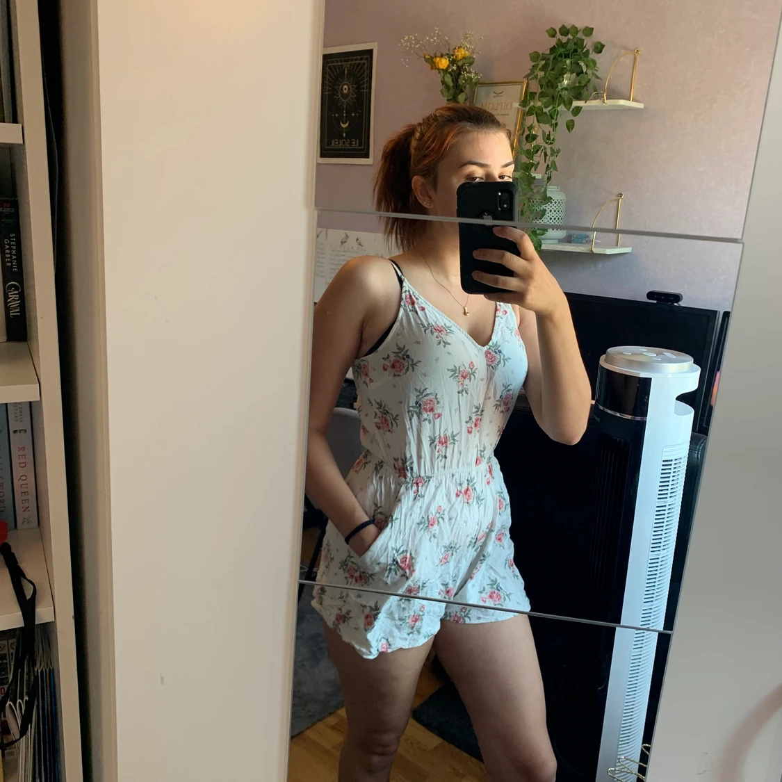 En vit byxdress med rosa och små mörkblåa blommor💕. Kort på mig som är 170 cm lång🌸. Den är söt och sval och passar till varma somrar. Köparen står för frakt🥰