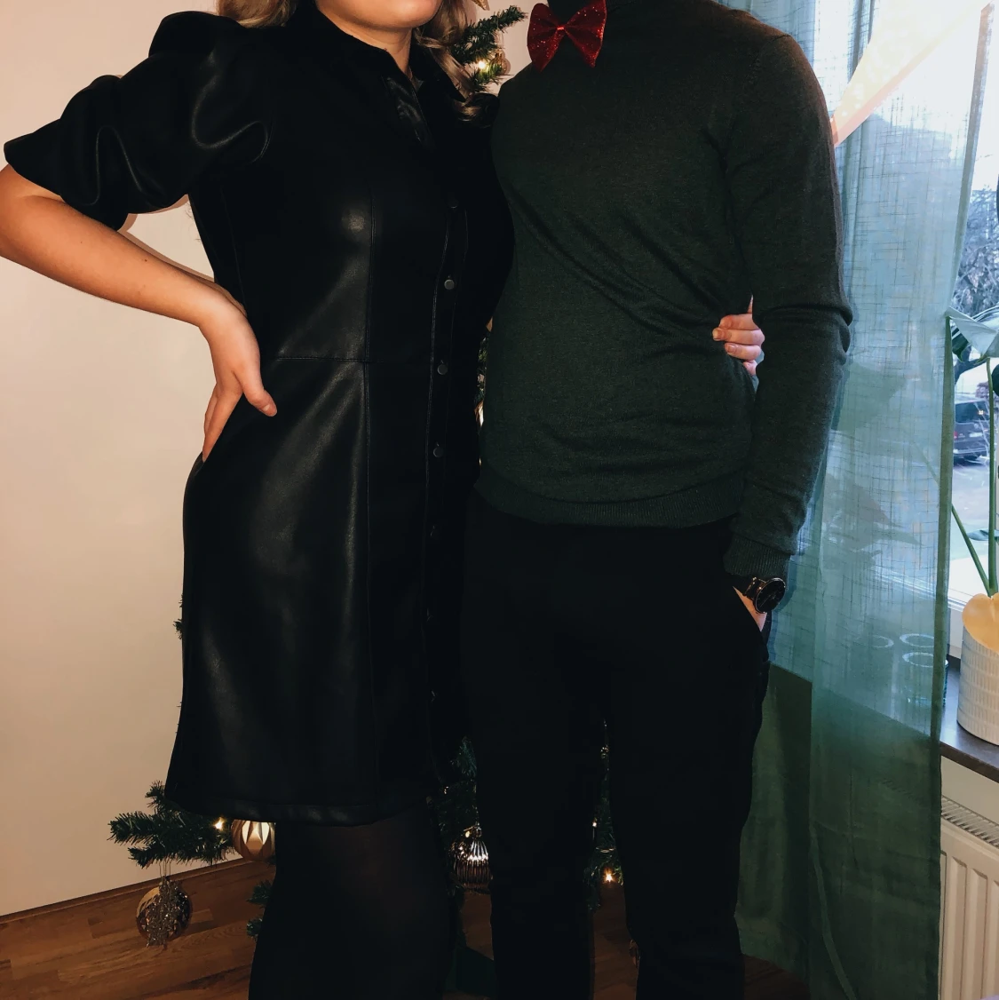 Klänning i skinnimitation från H&M storlek 42. Klänningen har puffärmar samt knappar som går att knäppa hela vägen. Säljer för 120kr