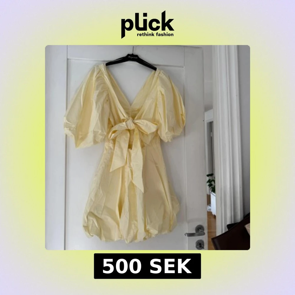 Säljer denna populära klänningen från H&M. den är ljusgul kort klänning med puffärmar och stor rosett i ryggen
