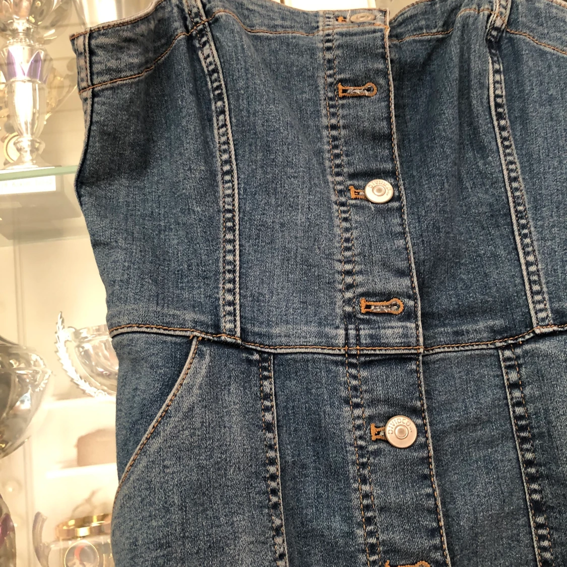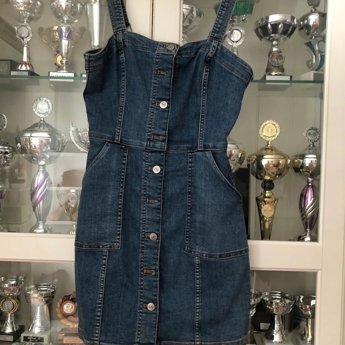 En jeansklänning från hm, formar figuren jättefint, perfekt till sommaren 💙 aldrig använd