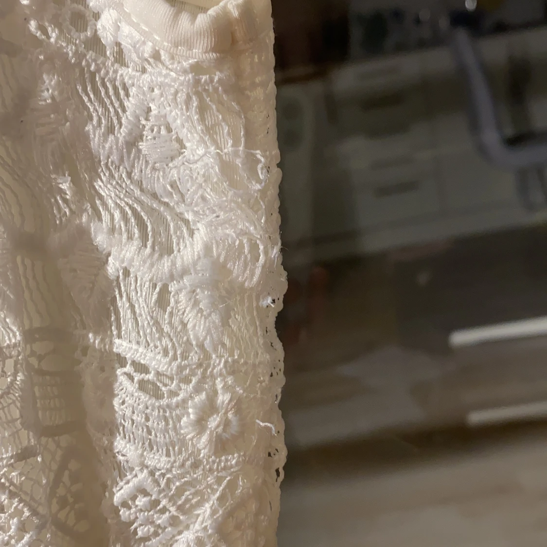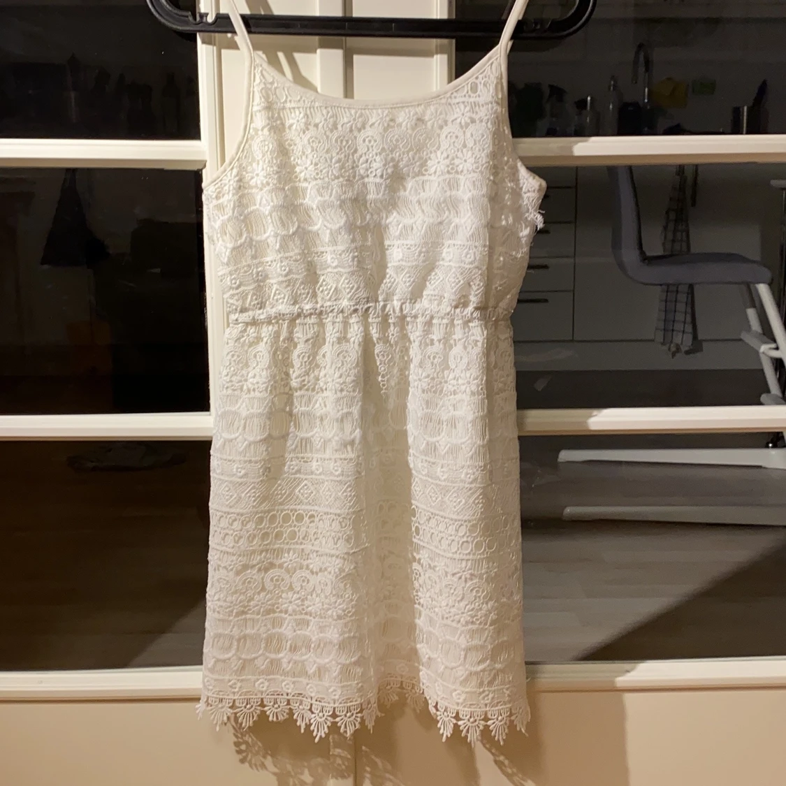 Vit klänning med spetsöverdrag. Från H&M och storlek Xs. Är i använt skick, har lite slitage i spetsen (vgs bild)
