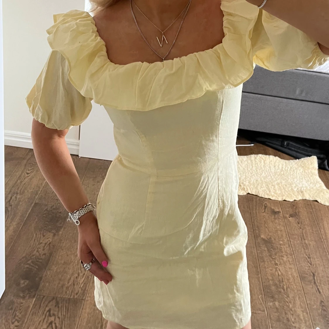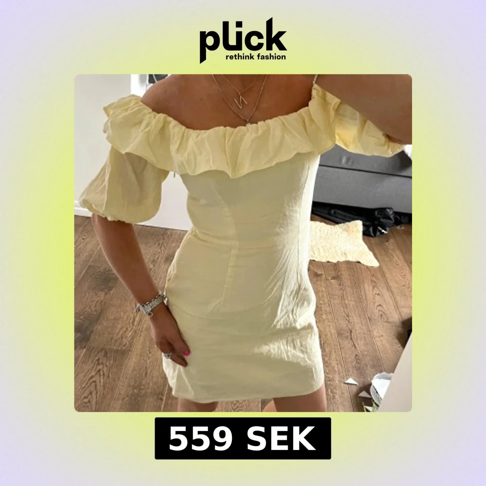 säljer denna otroliga och virala H&M klänningen som går att ha både off shoulder eller på axlarna💛💛🙌🏼❤️🔥🤩🥹 Storlek 36 men passar mig med XS så liten i storlek, snarare 34! såå bra skick!!
