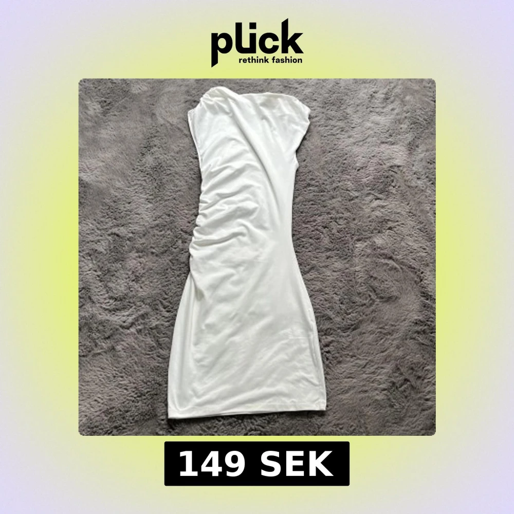 Supersnygg vit kort klänning från H&M Divided i storlek XS. Klänningen är ärmlös med en tight passform och har snygga rynkade detaljer längs ena sidan. Perfekt för dig som gillar en enkel men stilren look. Halsen är sne och går off the shoulder på ena armen.