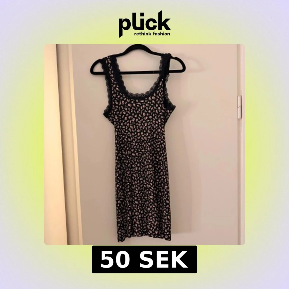 Svart ribbad klänning från H&M Divided i storlek S med små rosa och ljusgröna blommor. Klänningen är ärmlös och har spetskant runt halsringningen och axelbanden. Mjuk och stretchig bomullskvalitet, perfekt för dig som gillar söta detaljer och blommigt.