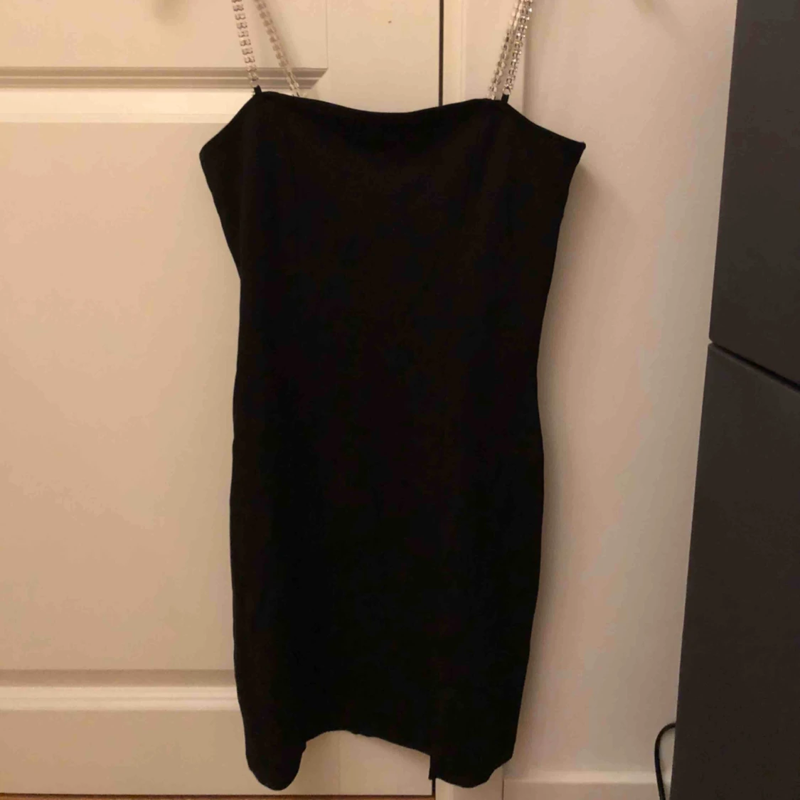Svart festklänning med silverstenar till axelband. Kortare klänning med en liten slits.