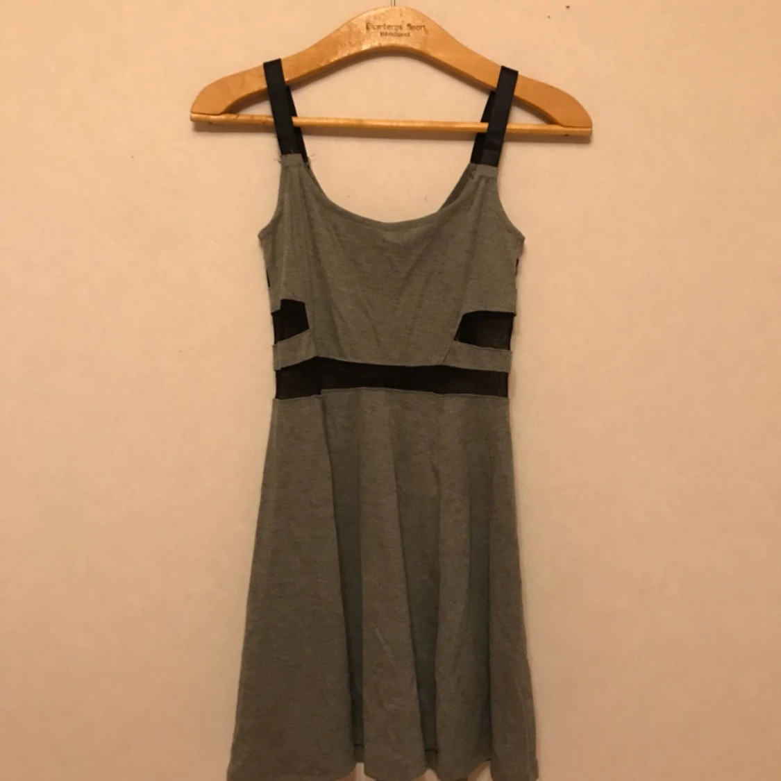 Väldigt figurnära grå klänning från H&M med svarta detaljer på sidan. Dragkedja i rygg. Svarta axelband. Storlek XS. Går till strax över knäna. Frakt tillkommer!