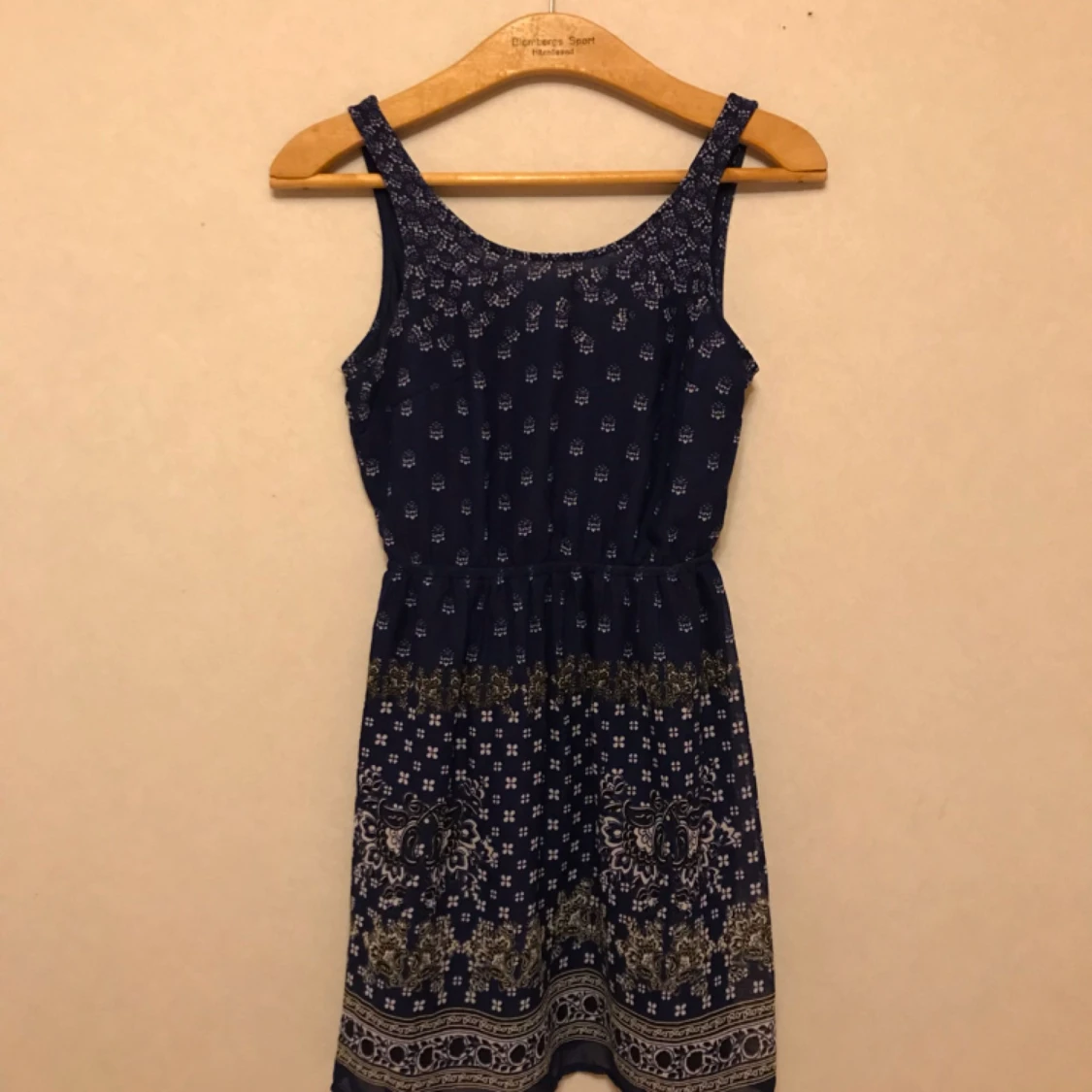 Mörkblå kort klänning från H&M med spännande mönster. Fin rygg med ett triangulärt hål som ger ett mer intressant utseende. Storlek 34. Frakt tillkommer.