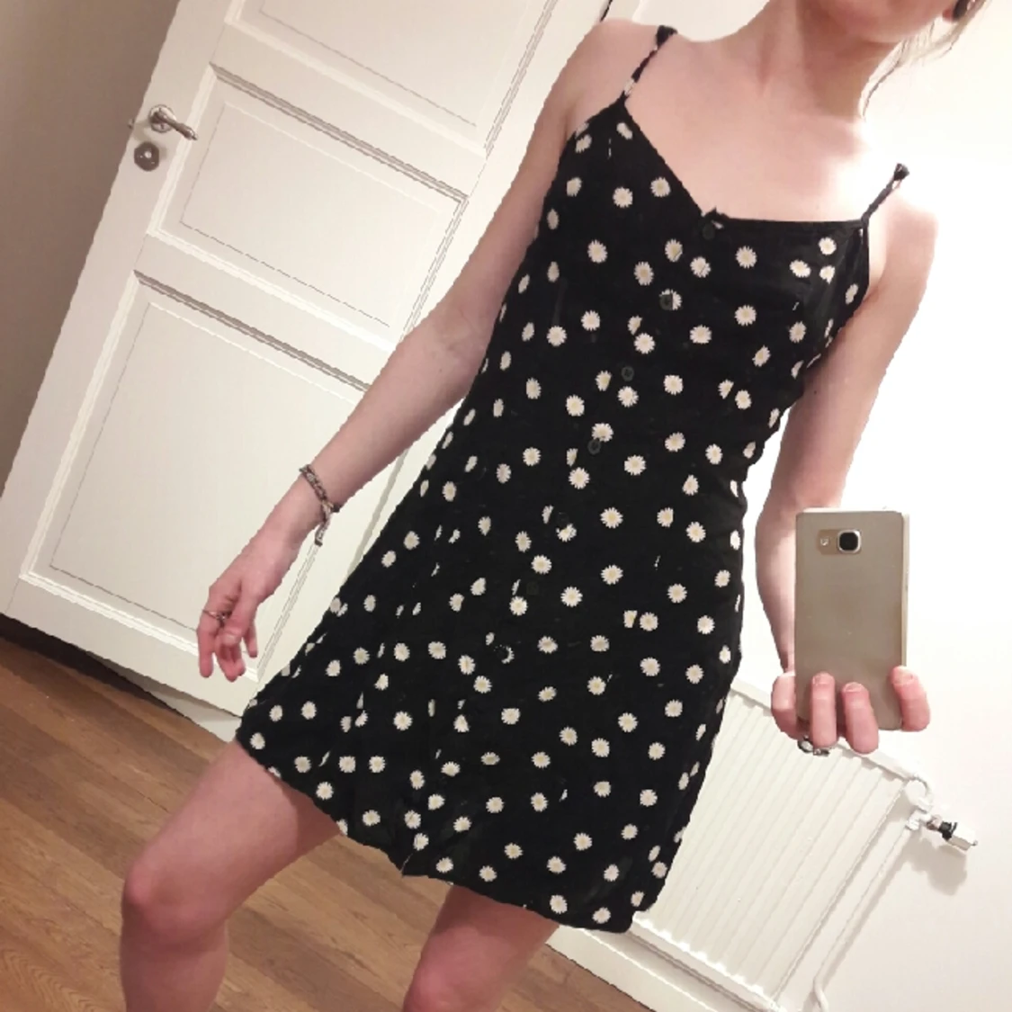 söt klänning med vita blommor, justerbara band o knäppning ända ner.