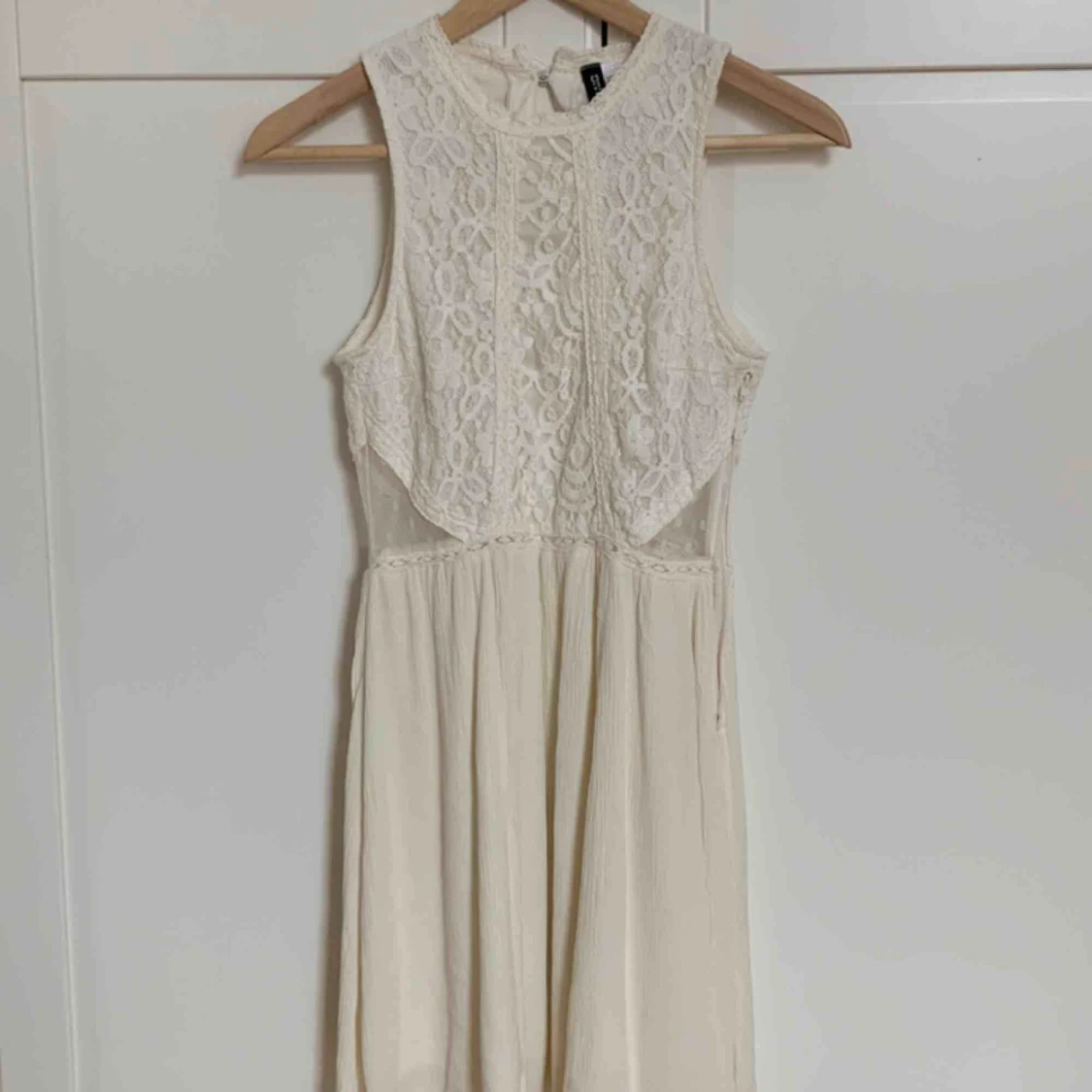 En lite beige insydd klänning som använts en gång. Spetts upptill och en luftig vid underdel.