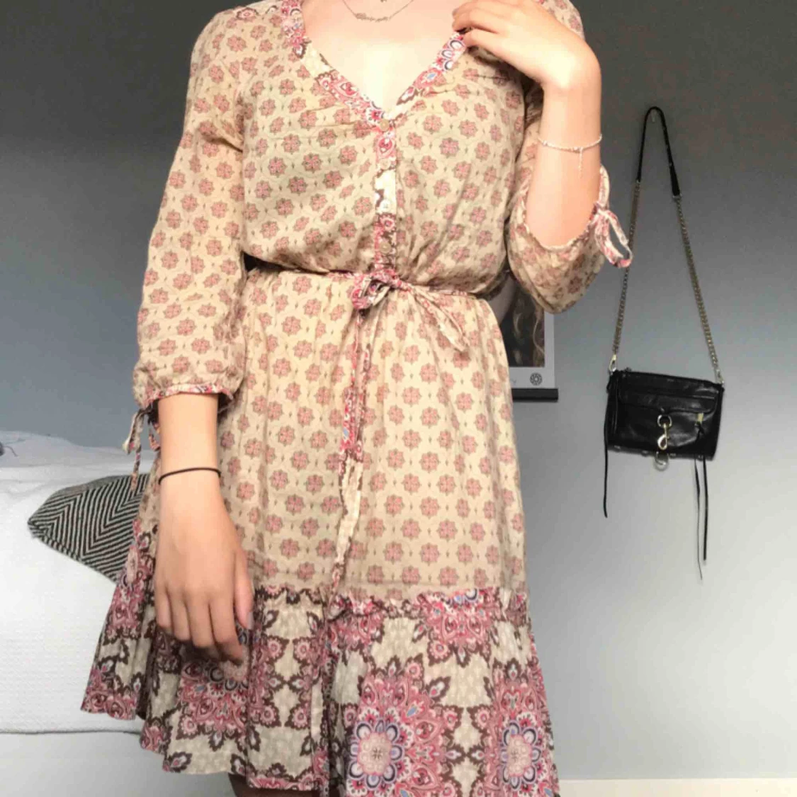 Super söt och sommrig klänning i tunnt och mönstrat tyg! Passar både XS/S/M. Knappar vid bröstet och band i midjan!