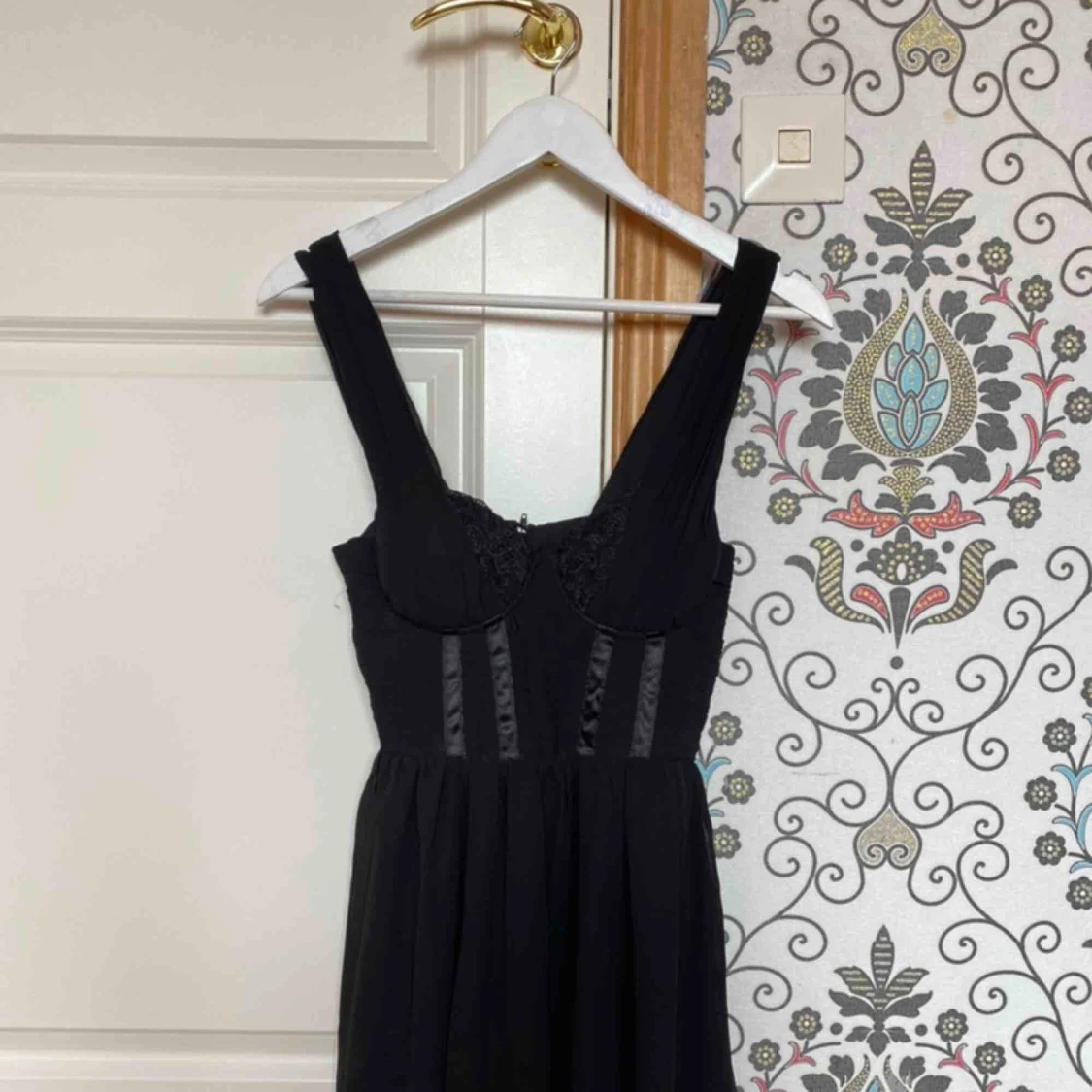 Svart klänning, slutar ovanför knäna.