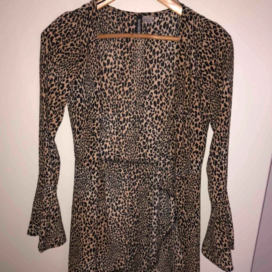 Svårt att få en rättvis bild med den är som sista bilden fast med volanger i ärmarna! Omlottklänningen i leopardmönster. Aldrig använd pga liten storlek
