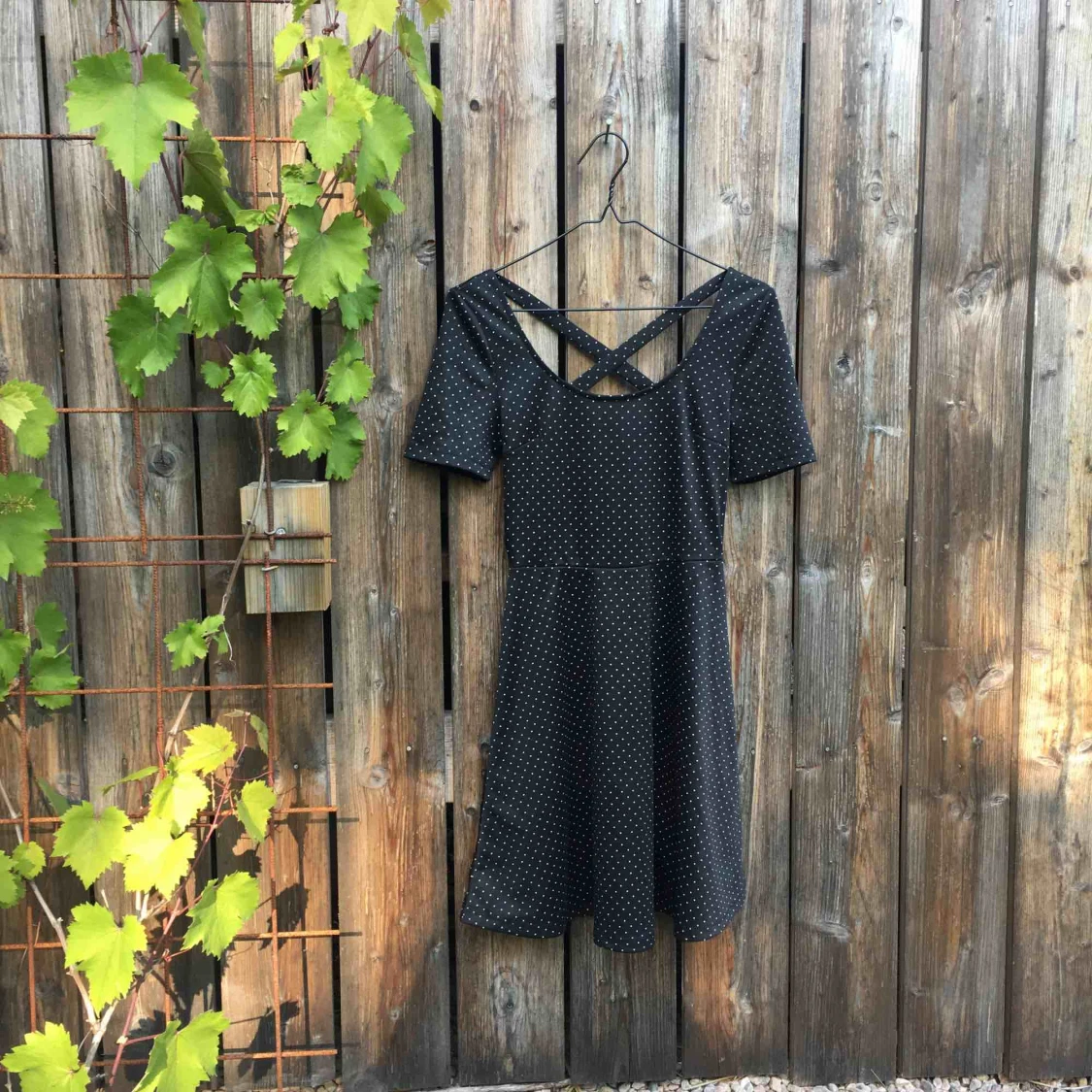 Använd vid endast ett tillfälle. Kort klänning med korsade band i ryggen. Åtsittande överdel, klockad kjol.