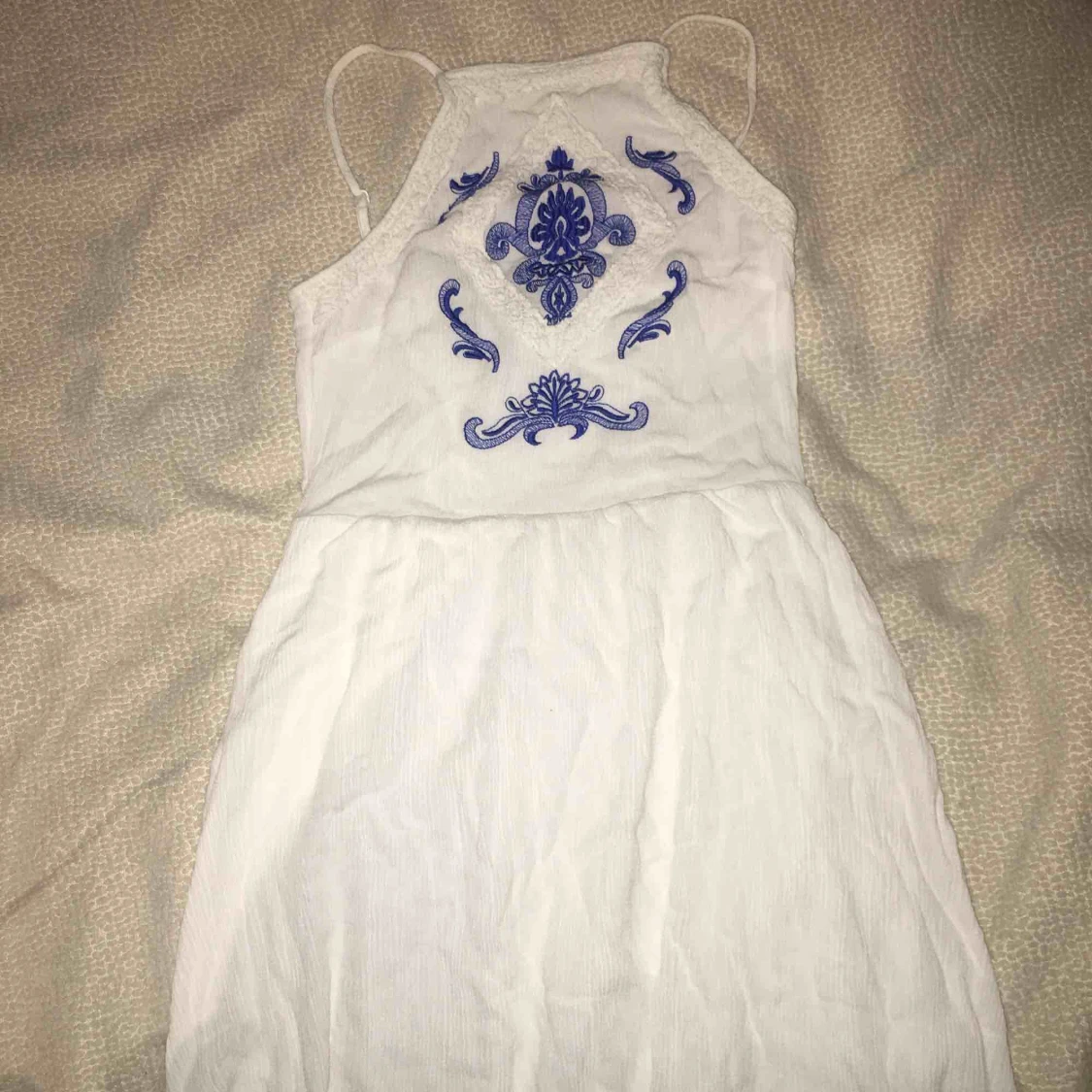 Vit klänning med blå mönster vid brösten. Är lagrad där nere (som visas i tredje bilden). Priset kan diskuteras :)
