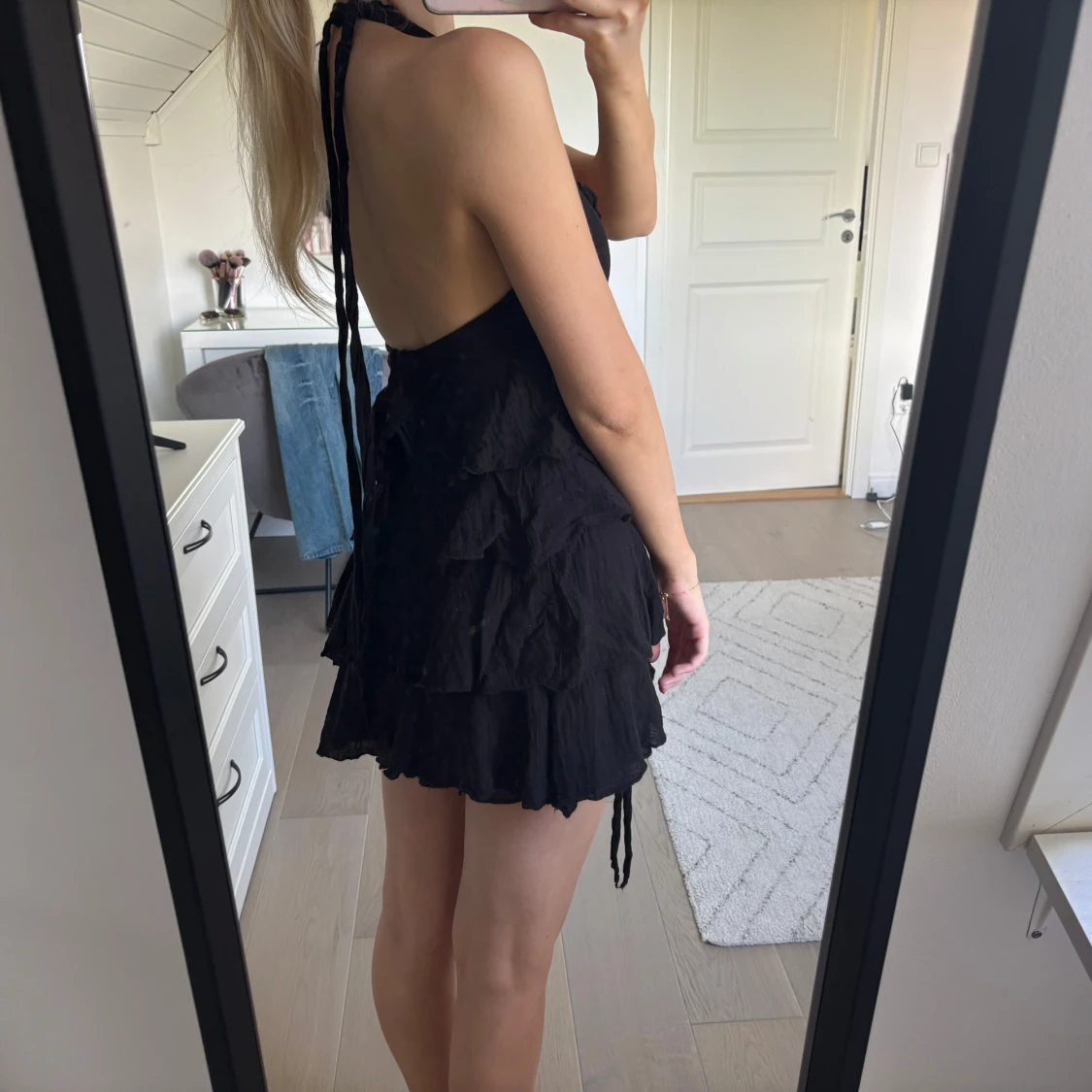 Supersöt svart miniklänning med halterneck och djup v-ringning. Denna har endast används ca 5 gånger så den är i superfint skick!🖤