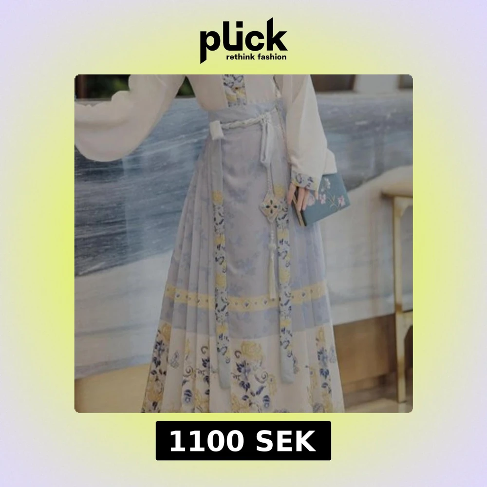 Säljer en elegant lång hanfu skjol Storlek S-L med blommigt mönster i ljusa toner av blått, gult/guld och vitt. knytband i midjan och vida långärmad skjorta i storlek XS-S.