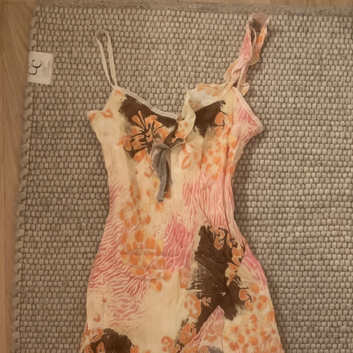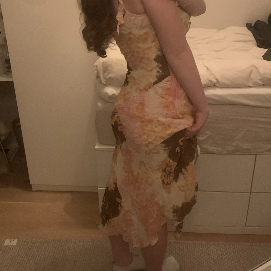 En jätte luftig medel lång klänning som går ner till mitten av vaderna, och som har hawaiian print i cream orange, brun och ljusrosa i olika prints.