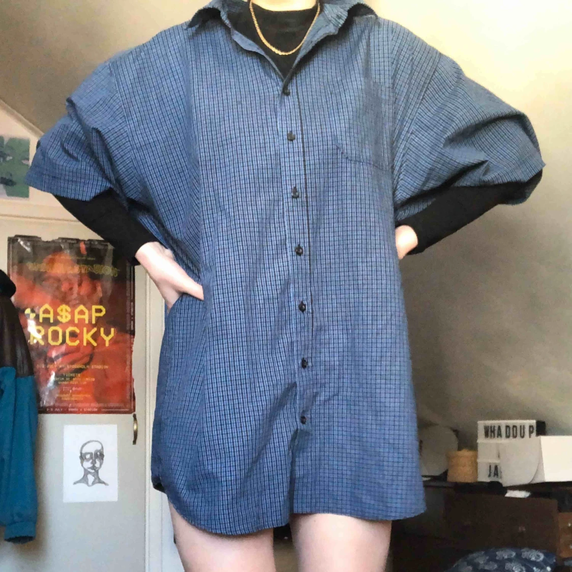 skitnajs skjorta! perfekt som tshirtklänning! jag är 175 och den är nog lång som klänning! najs med skärp i midjan också 🤩 frakt tillkommer!